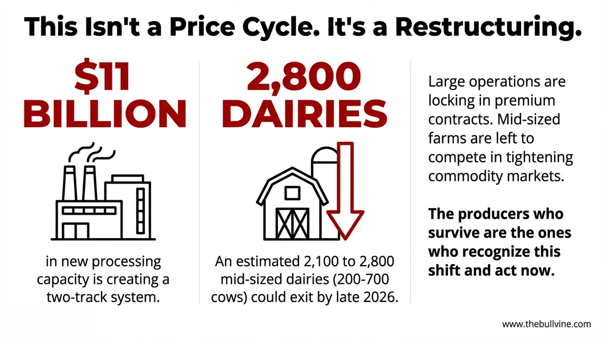 16,000 dairy farms gone between 2017 and 2022. A 40% decline—with thousands more exits projected this decade. After analyzing the profiles that resonated most with Bullvine readers this year, from Juan Moreno’s STgenetics infrastructure play to Jack Stookey’s 1980s tax-shelter collapse, one pattern emerged: survivors didn’t predict markets better. They structured risk so they could survive being wrong. Inside: a five-question framework to stress-test any major investment, the $10/cwt cost gap facing mid-sized operations, and practical strategies from producers who’ve cut break-even by $4/cwt. The core test for any expansion: does your operation survive if the thing that made it attractive disappears?