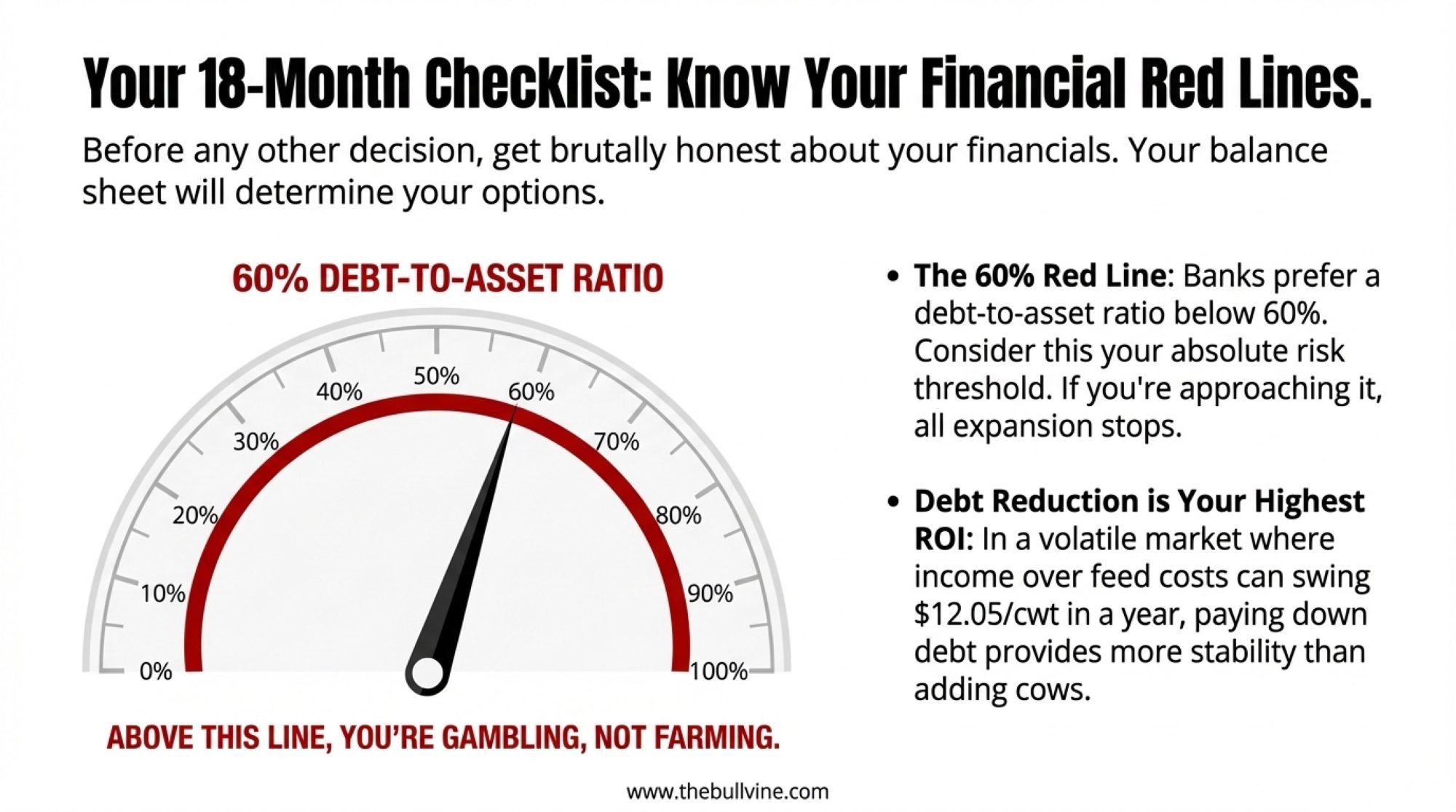 - Test expansion decisions against unfavorable conditions. What happens if milk drops to $16/cwt, feed costs spike 30%, and rates stay elevated? If the expansion fails that test, it’s speculation regardless of how the pro forma looks.