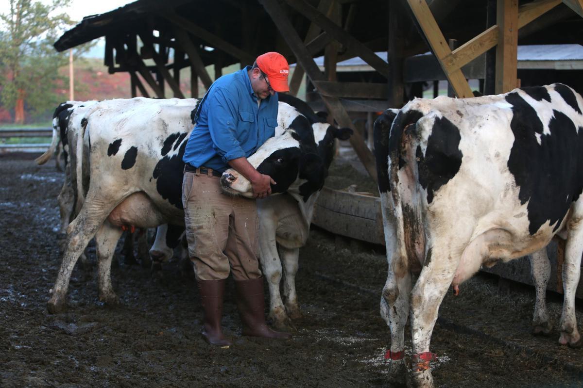 Bryan Matthews, a Virginia dairy farmer, pets a cow at his farm in Callaway. Virginia’s dairy farmers are witnessing a steep decline in sales since Mexico imposed a 15 percent tariff on fresh cheese and grated, shredded or powdered cheeses, as well as a 10 percent tariff on hard and semi-hard cheeses from the U.S. in June. Stephanie Klein-Davis/The Roanoke Times