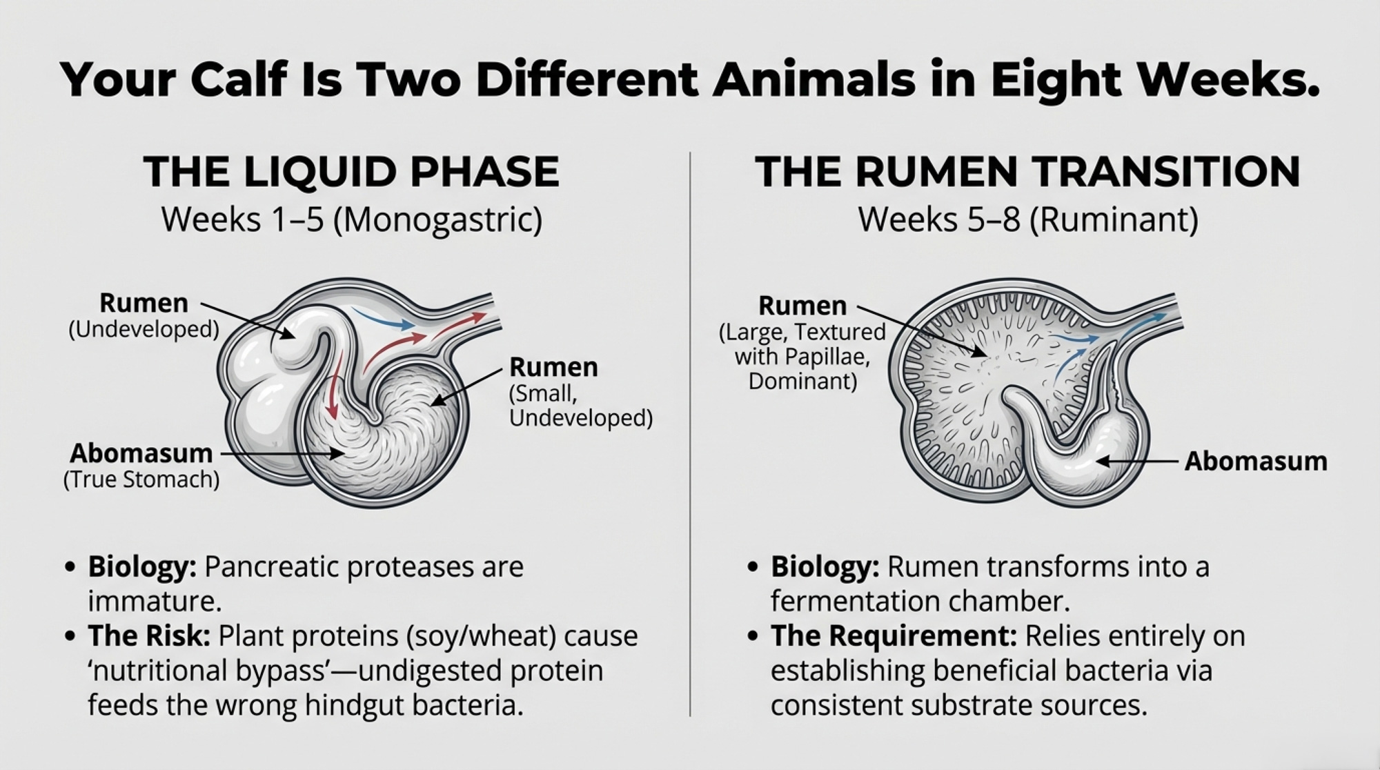 Before the rumen becomes functional—roughly weeks one through five—the calf is essentially a monogastric animal. The small intestine handles the heavy lifting for nutrient absorption, and it’s susceptible to early nutrition choices.