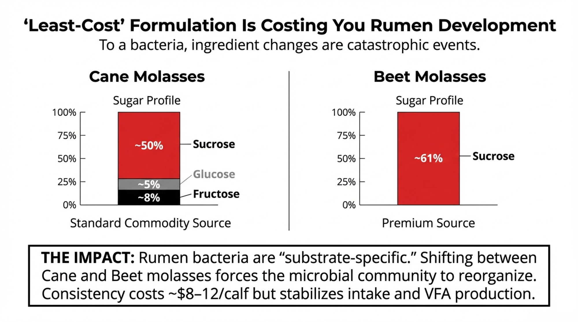 The differences between molasses sources illustrate the point nicely. Research by Palmonani and colleagues, published in the Journal of Dairy Science in 2020, characterized these differences precisely: cane molasses typically contains approximately 48-50% sucrose, 5% glucose, and 8% fructose. Beet molasses contains roughly 61% sucrose, with glucose and fructose barely detectable.
