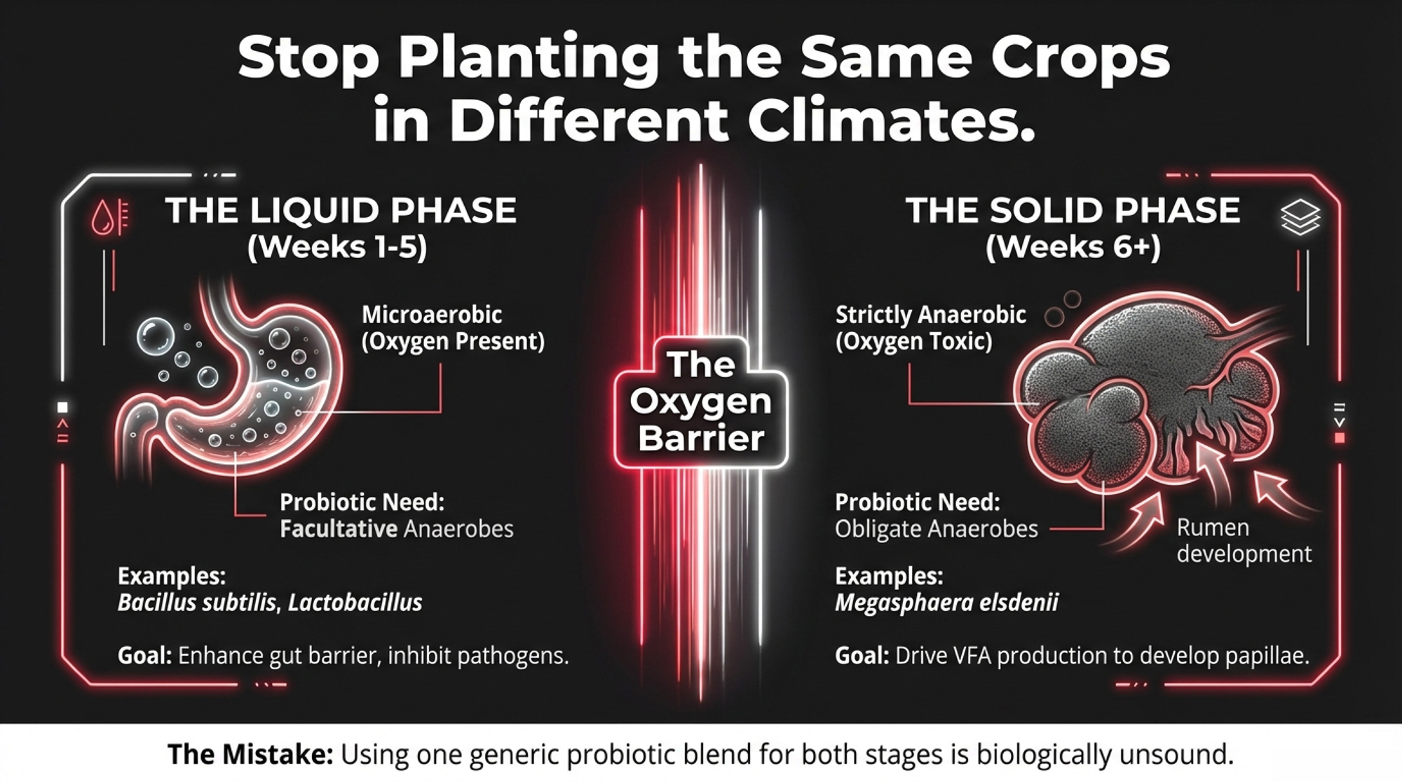 The developing rumen is a completely different environment—strictly anaerobic. Oxygen is toxic to the bacteria that should dominate there. Effective rumen probiotics include obligate anaerobes such as Megasphaera elsdenii and Butyrivibrio species, which would die immediately if exposed to the oxygen-rich environment of the small intestine.