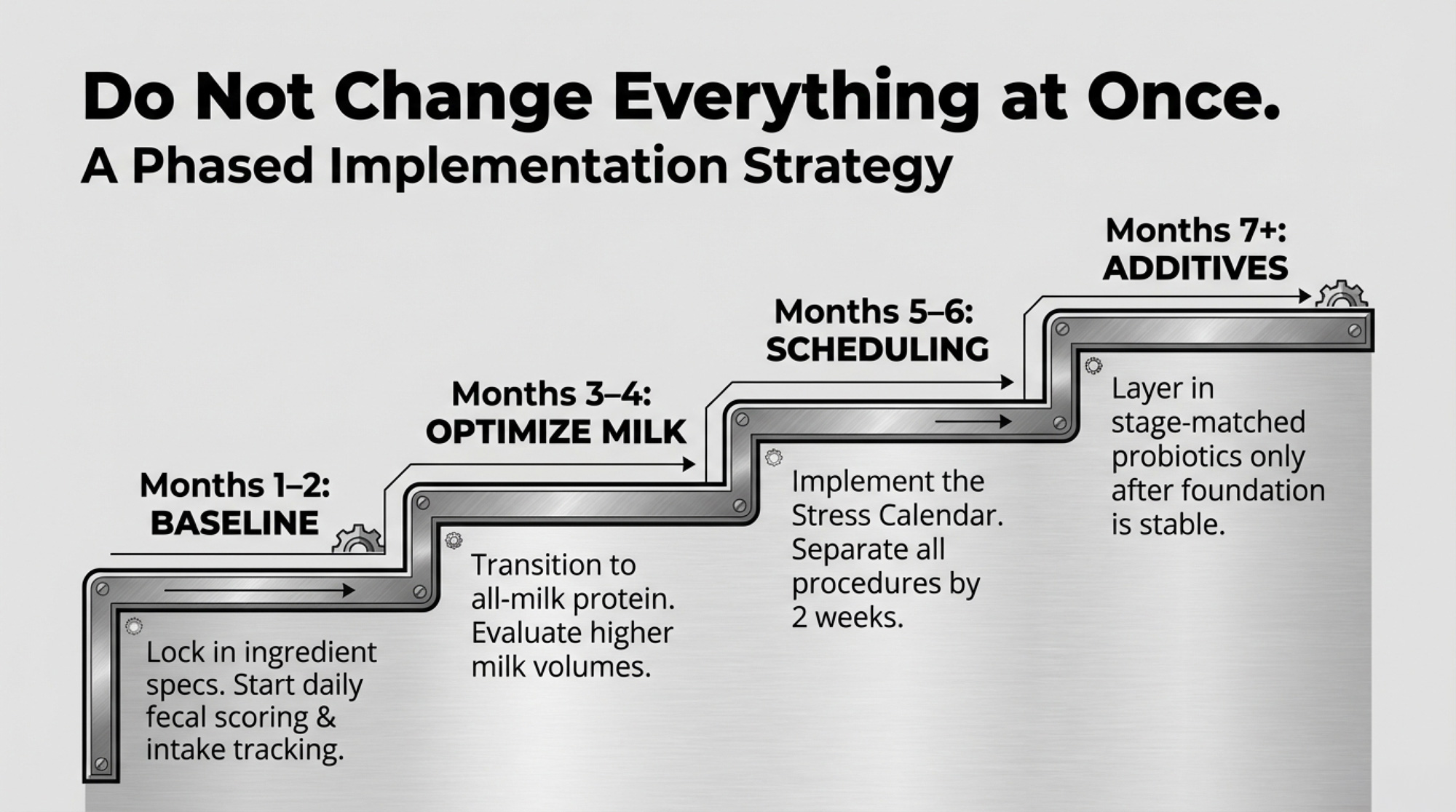 Be realistic about timelines. The full benefit of optimized early-life nutrition takes 18-24 months to materialize. Plan accordingly and ensure your operation can sustain the approach long enough to see results. Starting and stopping is worse than not starting at all.
