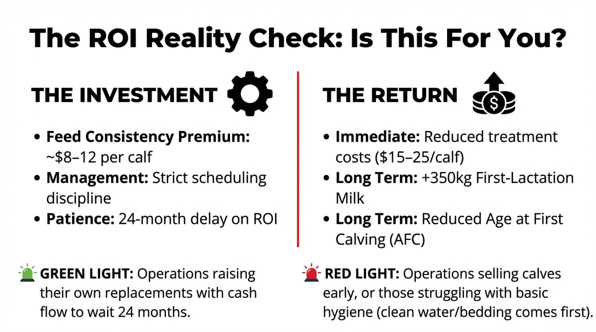 | Potential Long-term Return | +350 kg first-lactation milk | Per heifer kept healthy through weaning (Svensson & Hultgren research) |