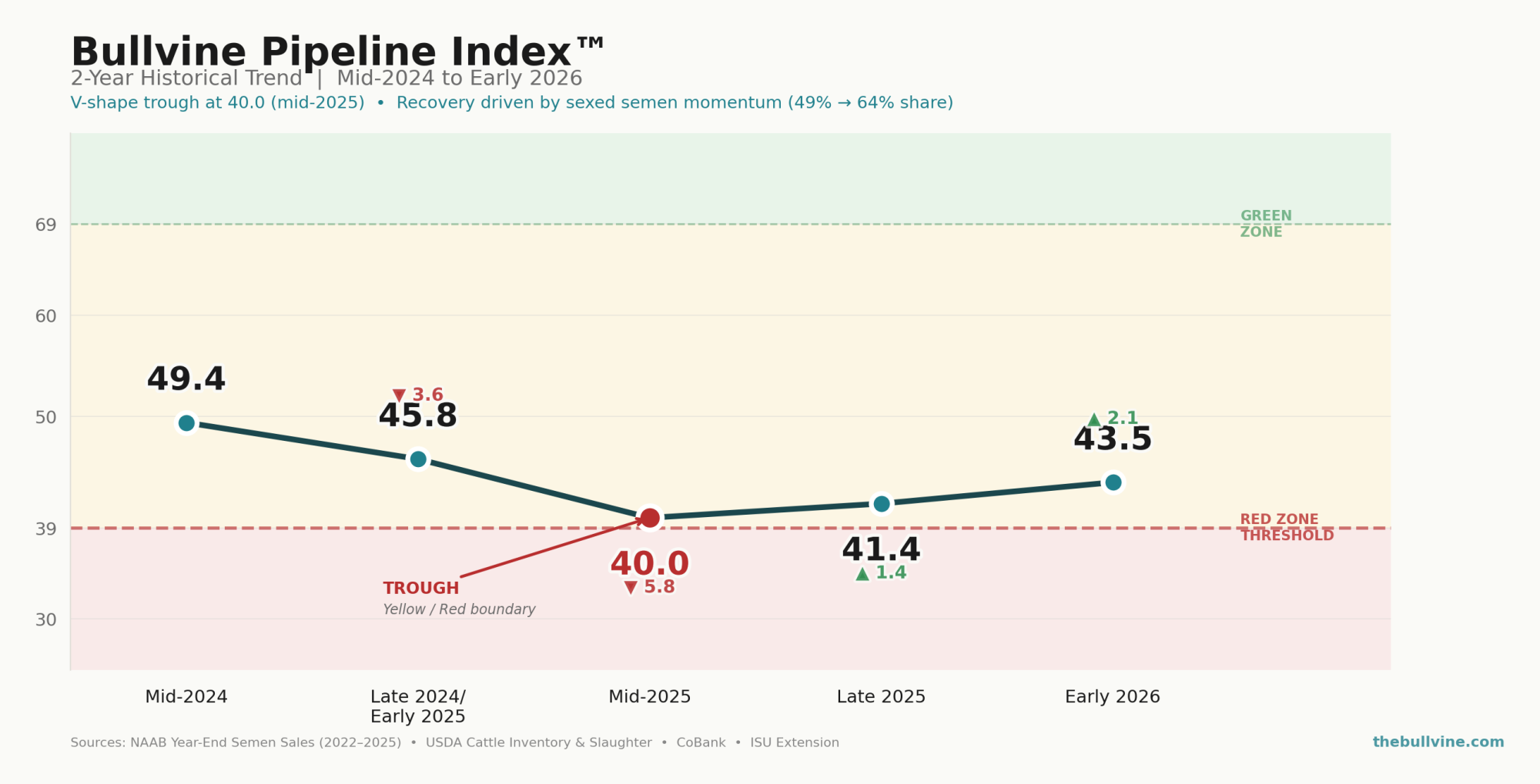 The partial bounce from 40.0 to 43.5 is driven almost entirely by one component: Semen Mix Momentum climbed from 35 to 60 as sexed dairy’s domestic share rose from 49 percent (2022 NAAB) to 64 percent (2025 NAAB). That’s the pipeline’s one genuine tailwind — producers shifted breeding behavior, and it showed up in the semen tank before it’ll show up in the milking string.