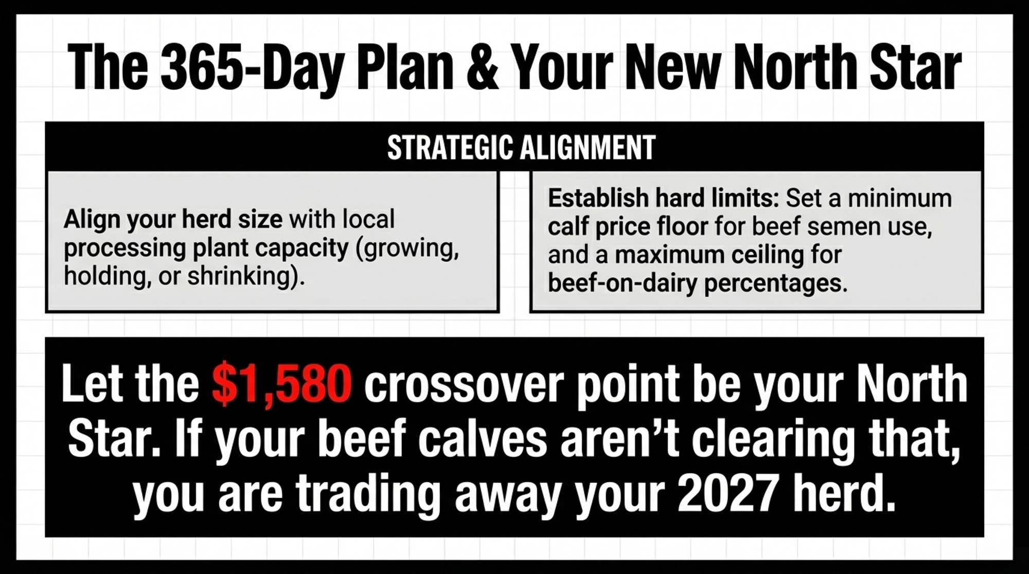 - Set hard floors and ceilings. Floor: the minimum beef‑calf price where beef services still make cash‑flow sense. Ceiling: the maximum percentage of breedings you’ll put to beef on viable dairy dams. The $1,580crossover is your north star.