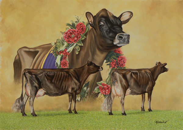 Sauder’s work has been juried into many exhibitions. He is resident artist at the Healdsburg Center for the Arts. Gary loves capturing the beauty and character of the cows he paints but he has just as much passion and concern for the dairy breeders themselves and for the generations to come. While he finds it difficult to pick a favorite from his work he does rise to the challenge. “If I had to choose one it would be my painting “The Jersey Cow.” He explains his choice. “This painting was the culmination of my Jersey experiences throughout my life and brought into play elements of many of my favorite cows that I had seen and admired from afar, as well as having had the great fortune to work with. Cows like Generators Sweet Dreams, KCJF Regency Treasure, Huronia Centurion Veronica, Lloyn Jude Griffen, Generators Topsy, Generators Imp, and Sunset Canyon MBSB Anthem and cows like that. After that I like the painting I did of my own cattle entitled “Jersey Fields” and that is for purely sentimental reasons. The next few are all special and I like the newest one for Brady Core of “Ritzy” and I really like the painting of “Kit Kat” that I did for George Colpetzer.