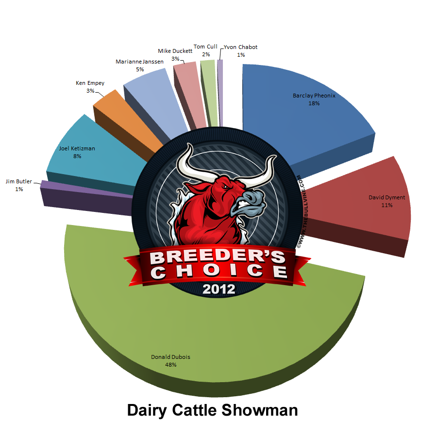 Obviously having judged the Royal or World Dairy Expo this past year didn’t hurt in this category. With 2012 Royal Winter Fair Judge Callum McKinven edging out 2012 World Dairy Expo, Mike “Air” Heath. (Read more World Dairy Expo 2012 Holstein Show – A battle for the ages and The 2012 Royal Winter Fair Holstein Show – One of the greatest stories ever told!)