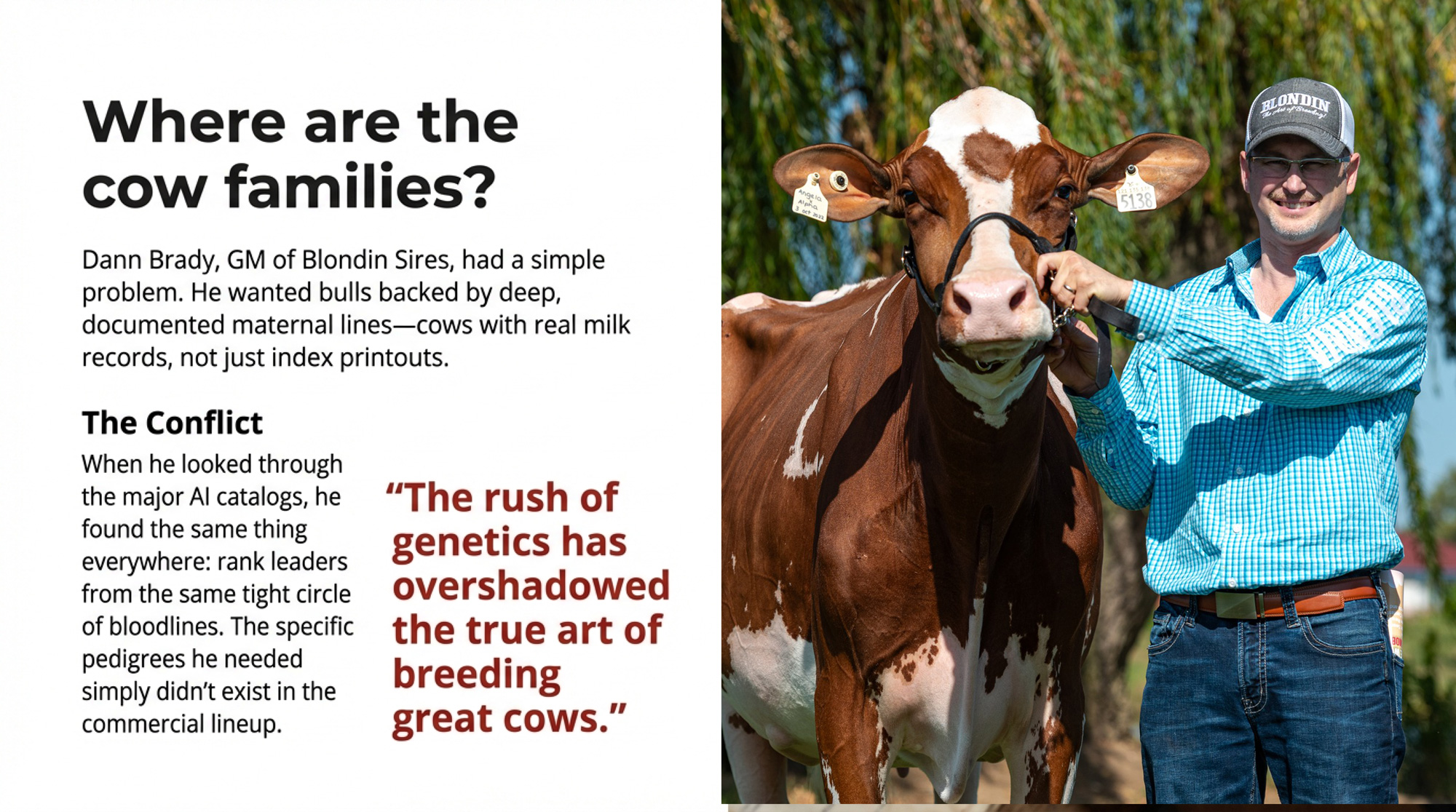 Dann Brady had a specific problem. The General Manager and Co-Founder of Blondin Sires in St. Placide, Quebec, wanted bulls backed by deep, documented cow families — sires where you could trace maternal longevity and functional type back through generations of real milk records, not just index printouts. He went looking through the major AI catalogs. What he found were rank leaders from the same tight circle of bloodlines everyone else was already using. What he couldn’t find were the pedigrees behind them.