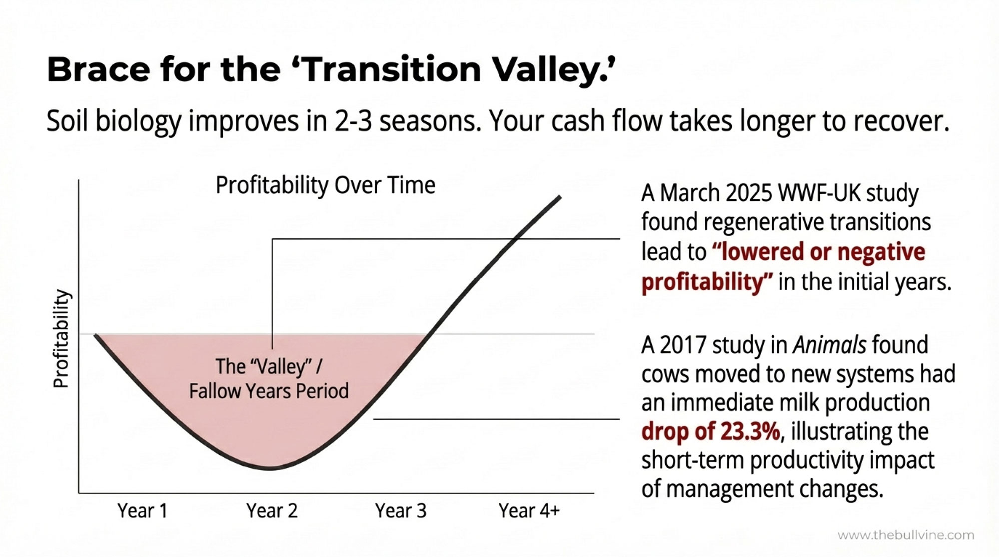 The most comprehensive recent modeling on regenerative transition economics comes from a March 2025 WWF-UK study conducted by Cumulus Consultants and the Andersons Centre. Now, I know what you’re thinking—UK data for American operations? Here’s why it still matters: the biological lag time of soil adaptation is universal. Whether you’re in Devon or Wisconsin, soil biology follows the same fundamental timeline. The microbial communities rebuilding your soil structure don’t care which side of the Atlantic they’re on.