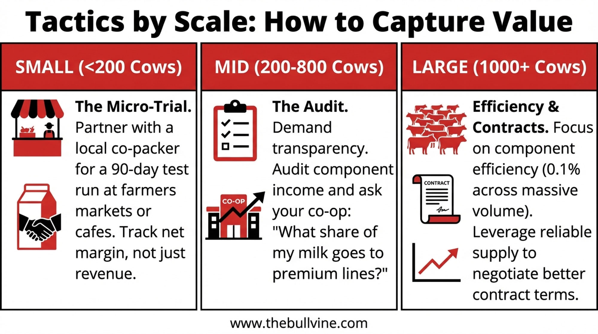 | Farm Size | Annual Milk Volume | Scenario A: Co-op Retains 100% (Zero Cash) | Scenario B: Co-op Shares 50% of Whey Margin as Cash Patronage (+15¢/cwt) | Scenario B Impact: Dollars Per Cow Per Year | Farm-Level Decision Question |