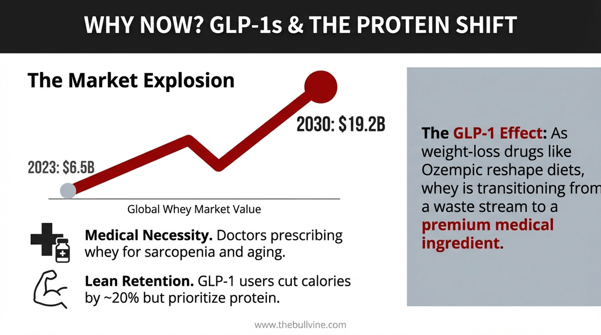 - Whey demand is structural, not hype: GLP-1 drugs and protein-obsessed consumers are pushing the global whey market from US$6.5B (2023) toward US$19.2B by 2030—a near tripling in seven years.