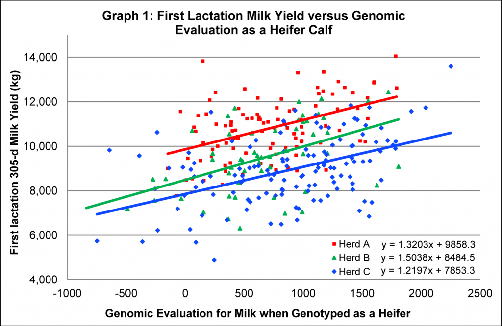 Dramatic changes have occurred in dairy sire selection practices in recent years. These changes have been facilitated by the sequencing of the bovine genome, which led to the discovery of thousands of DNA markers, known as single nucleotide polymorphisms or SNPs. The development of predicted breeding values based on marker data alone (Meuwissen et al., 2001), coupled with a reduction in the cost of genotyping, has allowed for accurate genomic selection of dairy sires by AI centers. As described by Hayes et al. (2009) genomic selection refers to selection decisions based on genomic breeding values (GEBV). Before continuing the discussion on genomic selection, however, it is important to understand traditional progeny testing. Historically, progeny testing was key to genetic improvement of dairy cattle (Sattler, 2013), via identification of the best bulls for widespread use and as sires of bulls for the next generation.