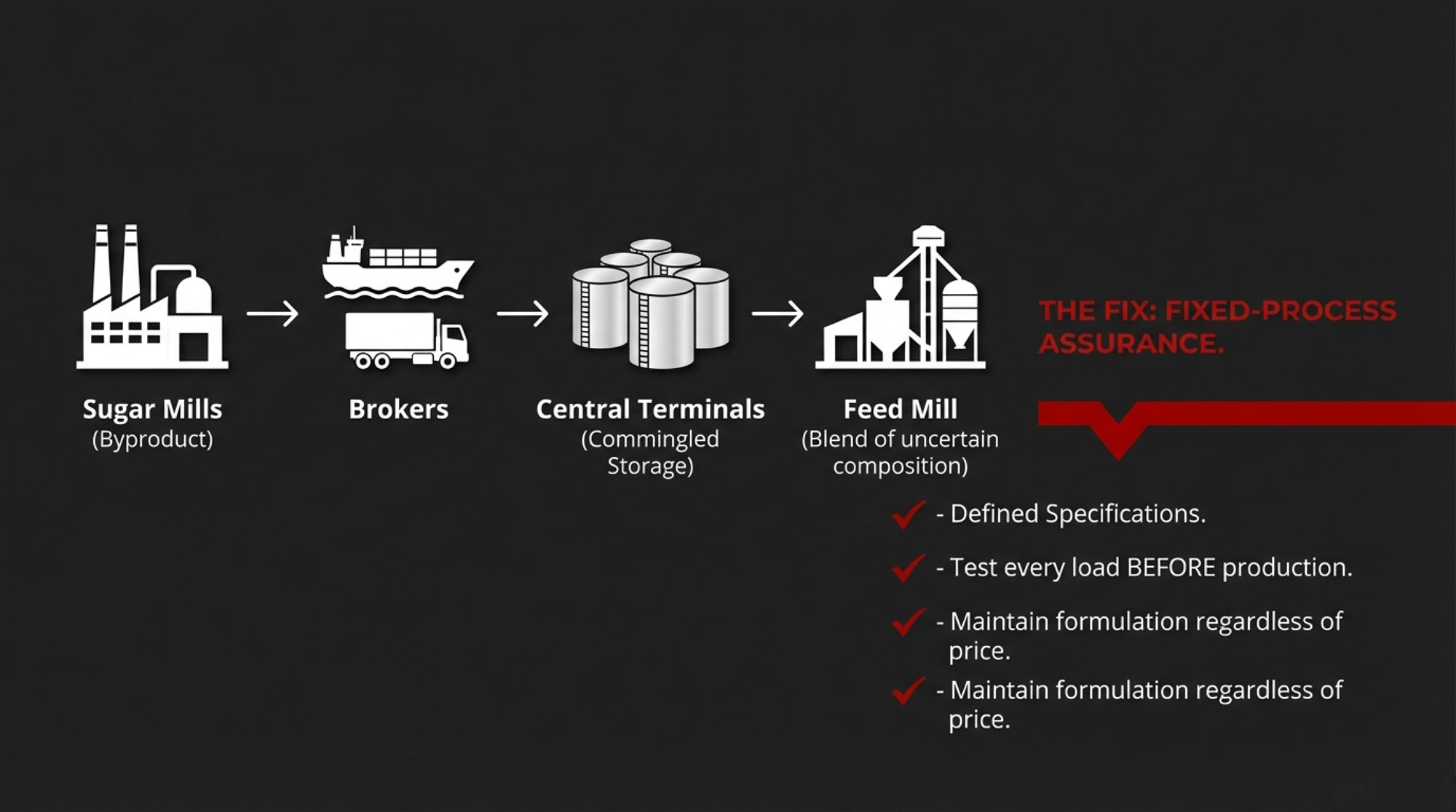 Most molasses travels through multiple stages: sugar mills produce it as a byproduct of varying quality, brokers purchase from multiple sources across regions and seasons, and central terminals often commingle batches in shared storage. By the time a tanker reaches a feed mill, the contents may be a blend of uncertain composition.