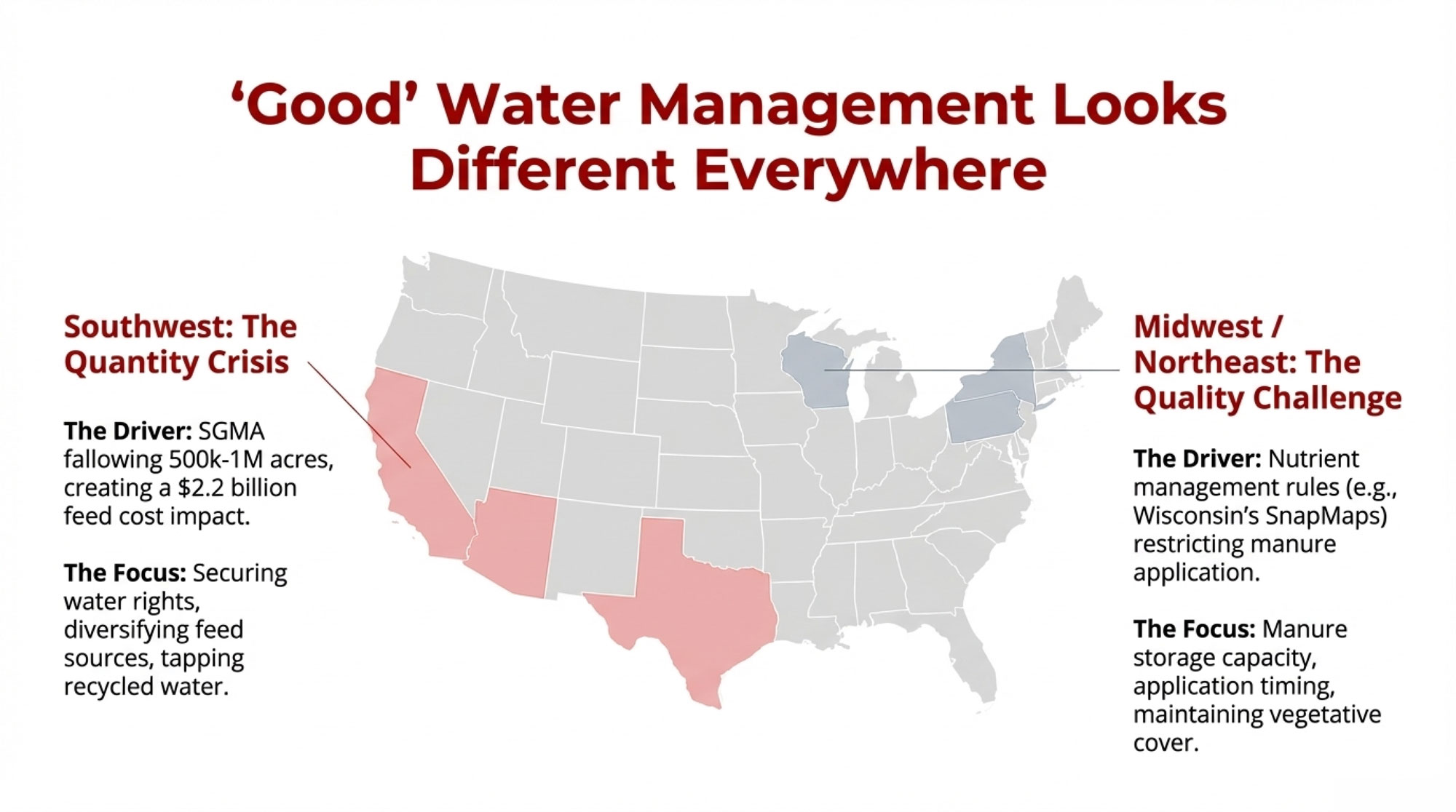 Southwest dairy producers face increasing water restrictions and rising costs for heat-stress management. Southeast operations are wrestling with not just heat stress but also limited local feed production and basis challenges that add $30-40 per ton to feed costs. The Upper Northeast faces geographic isolation that creates significant transportation penalties that can substantially erode margins.