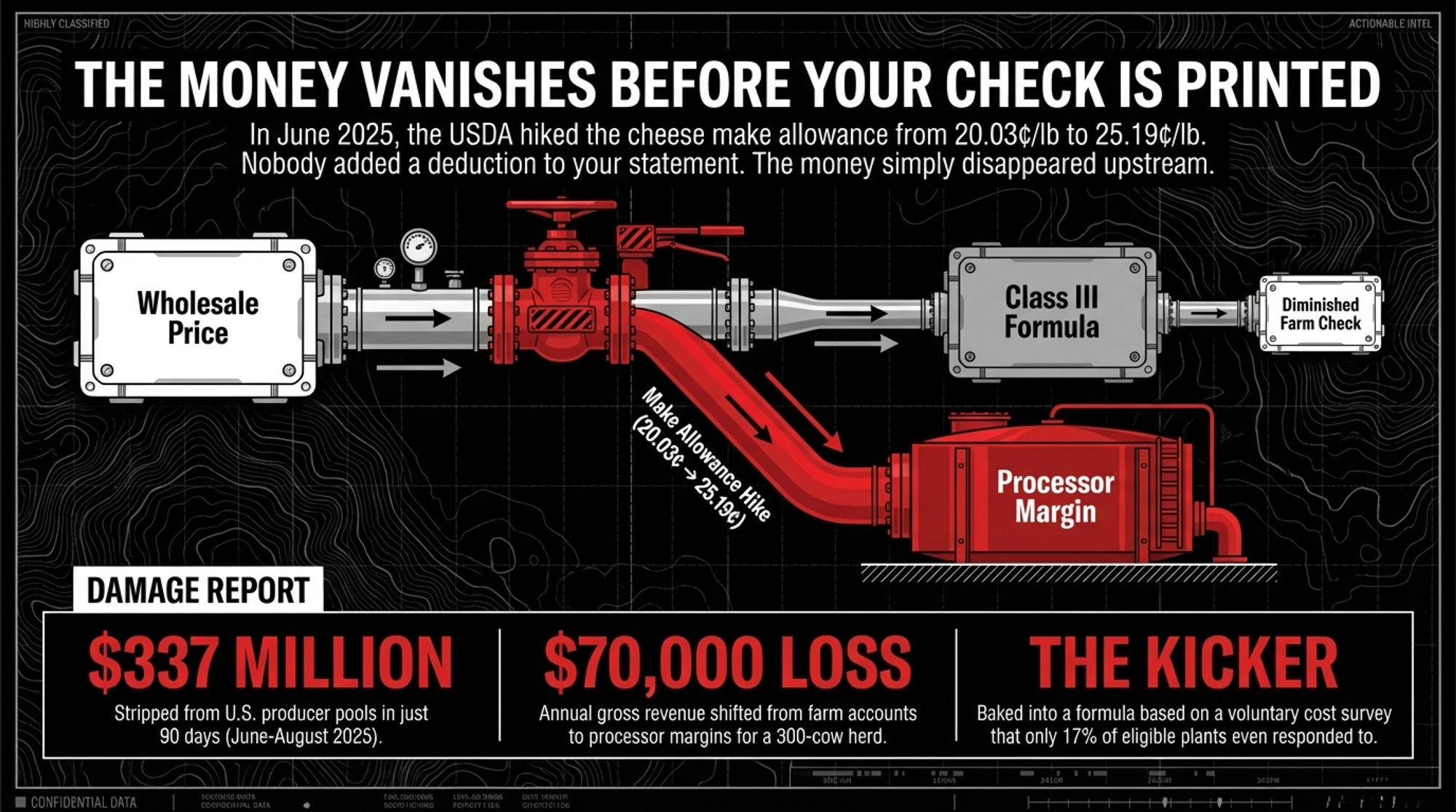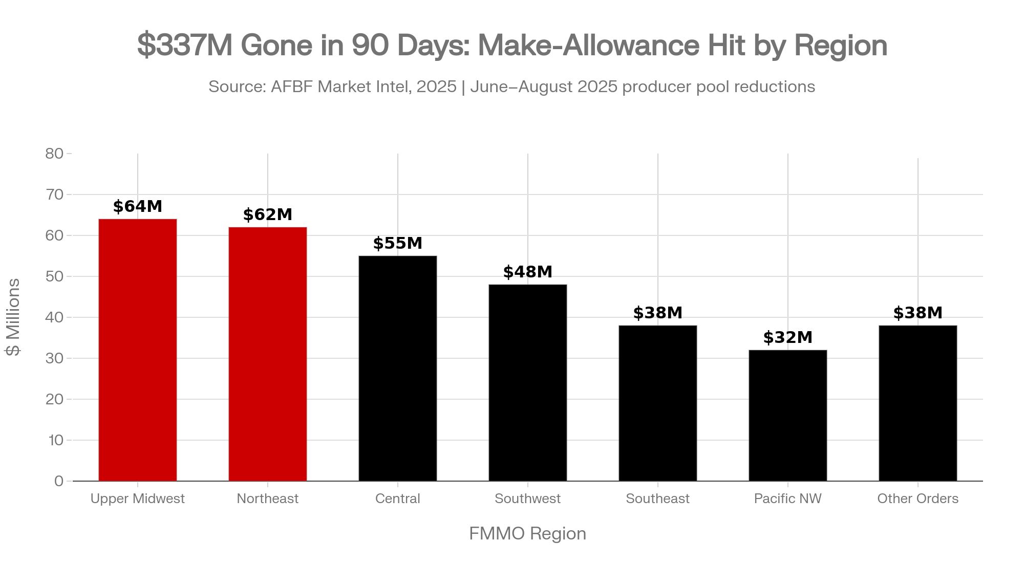Danny Munch at AFBF did the math. The new make allowances stripped $337 million from producer pools in just 90 days — June through August 2025 (AFBF Market Intel, 2025). That included about $64 million from the Upper Midwest and $62 million from the Northeast. Class price reductions ranged from 85 to 93 cents per hundredweight. Terrain Ag’s analysis was blunt: “Increased make allowances will have the most clear-cut negative effect on component values and milk prices.”