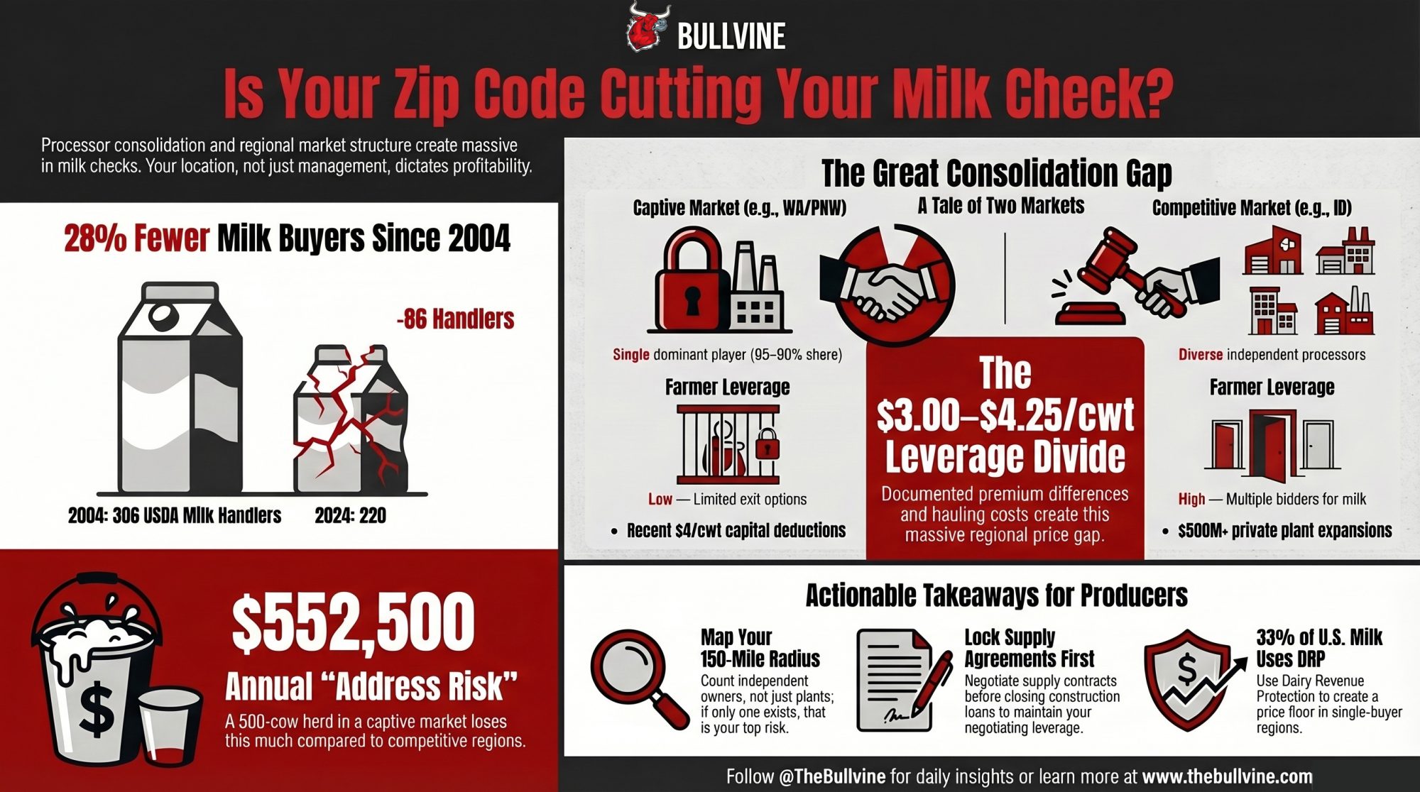 Processor consolidation has cut U.S. milk handlers by 28% in two decades. The gap between competitive and captive markets now runs $3–4/cwt — and your address determines which side of that line you’re milking on.