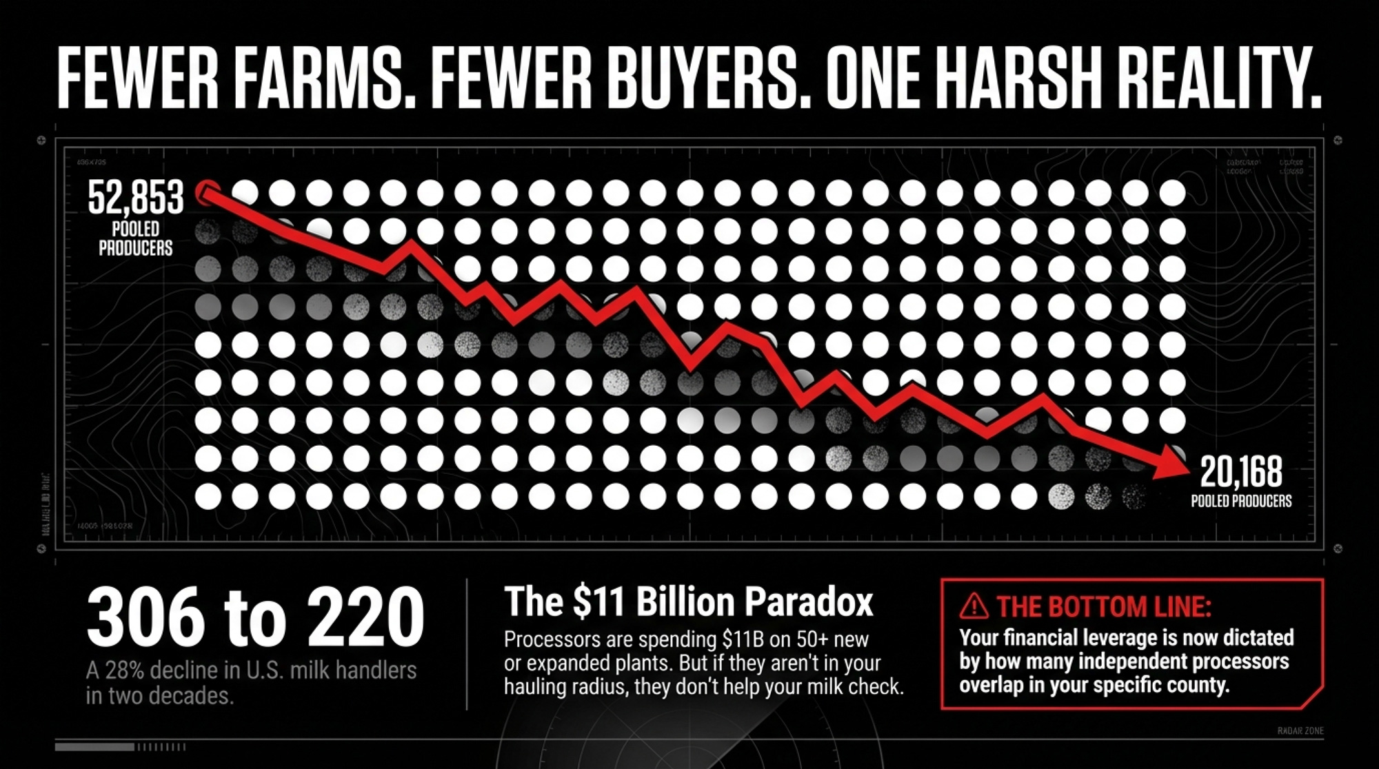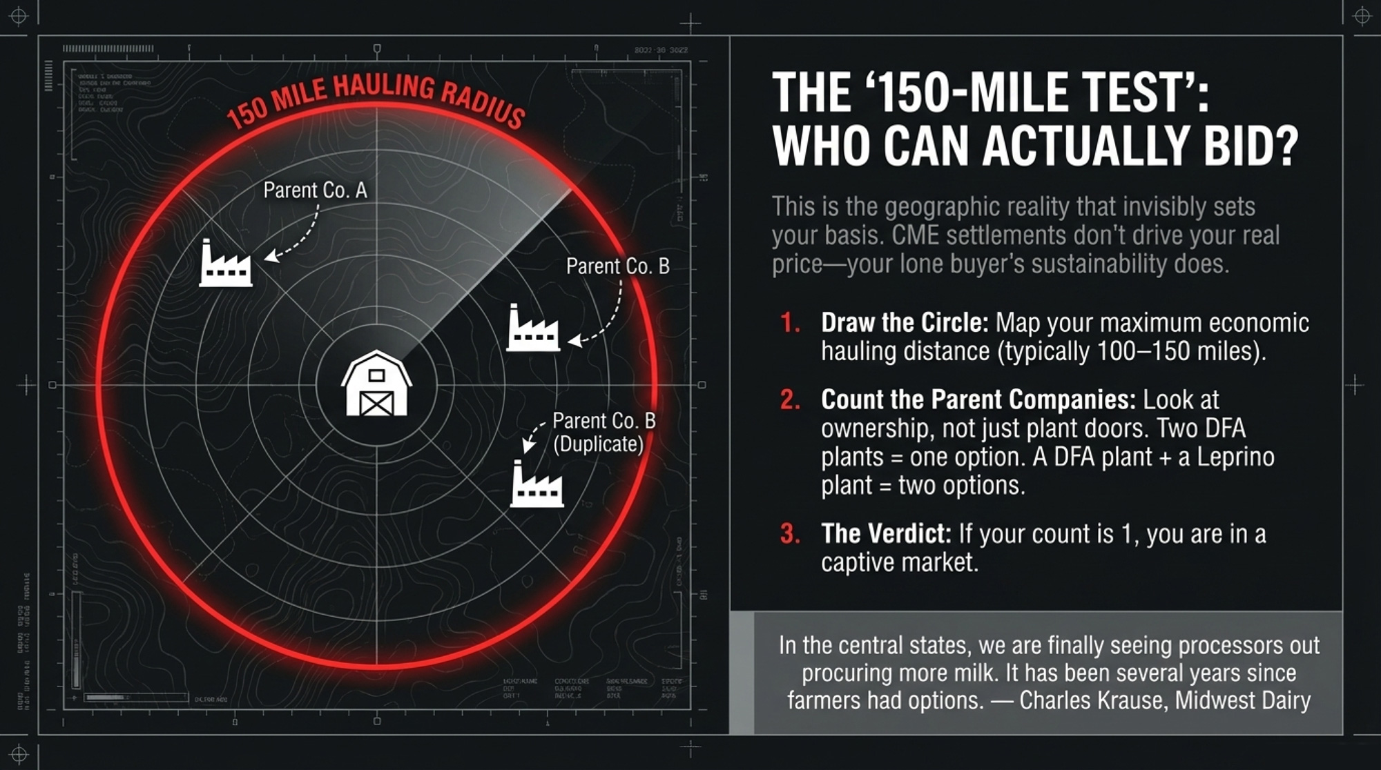 Set aside an afternoon. Pull a map and mark every plant within your realistic hauling radius: who owns it, what it makes, whether it’s expanding or shrinking. Count independent buyers, not just plant dots. If it’s one, that’s your biggest business risk — bigger than any single feed line. Lenders are starting to stress-test processor dependency alongside debt coverage, especially after 2025’s make-allowance shock and the Darigold overrun.