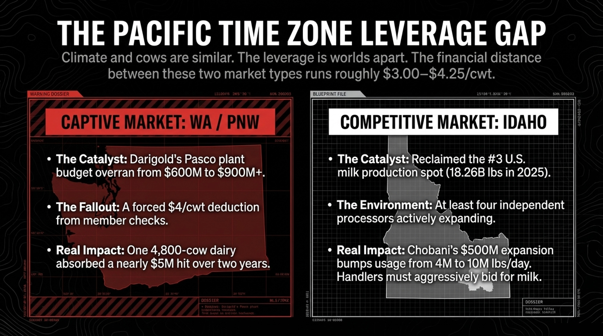 The sharpest contrast in American dairying right now sits inside the Pacific time zone. Same climate band. Very different leverage.