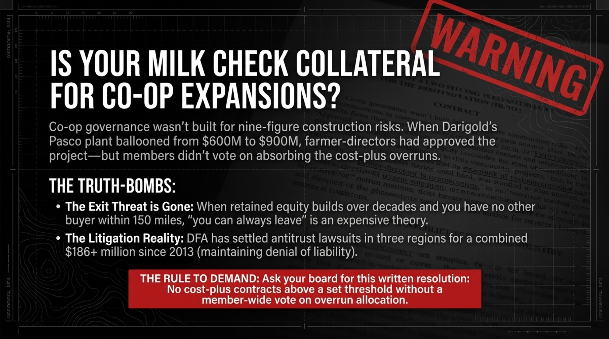 - If your co-op can approve nine-figure plant projects without a member vote on cost-control terms, assume your future milk checks are potential collateral. Ask for fixed-price contract disclosure and a written cost cap before the next build — not after the overrun.