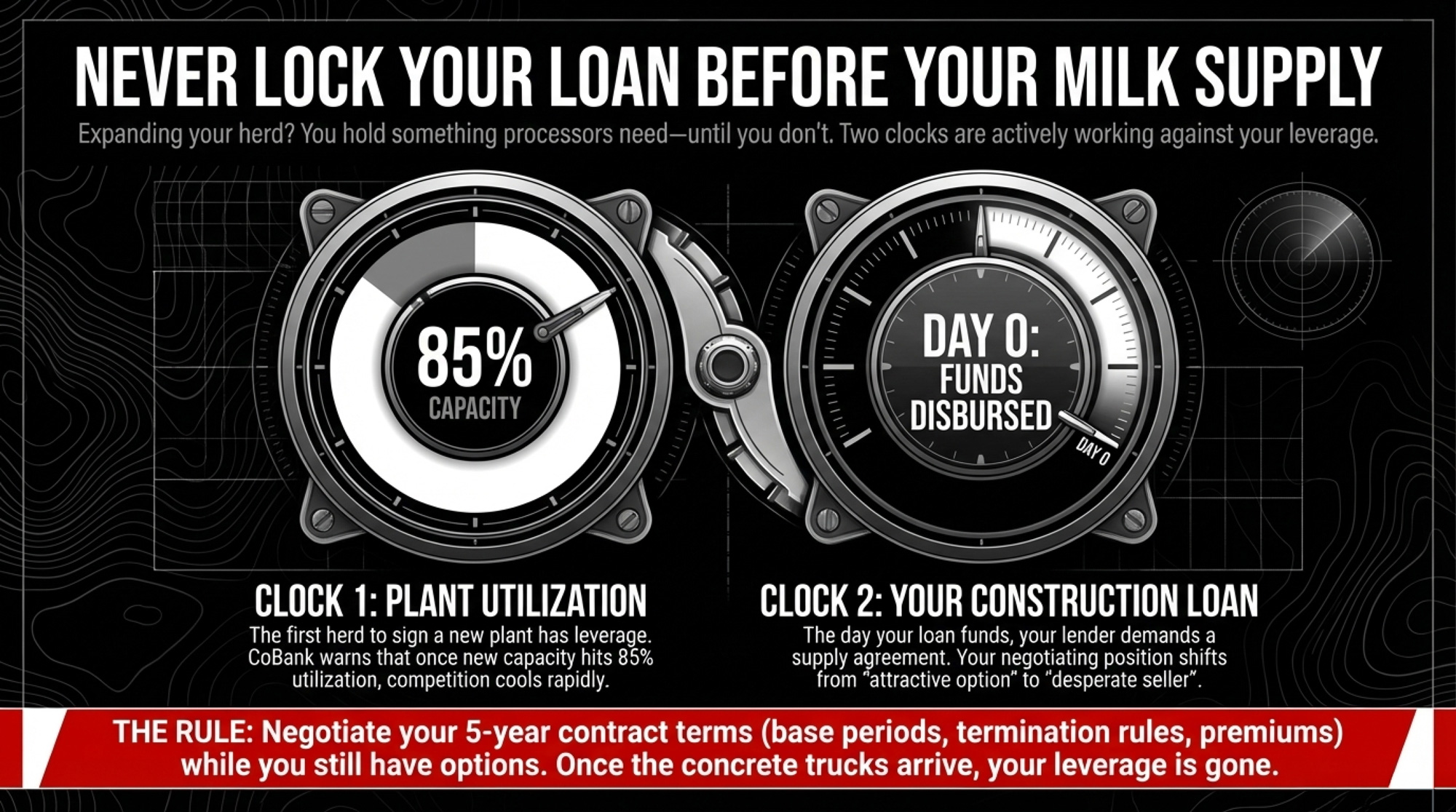 Your leverage window is the 60–120-day period when new plants are still filling capacity, and you haven’t yet signed the building loan. Use it. Ask for a base period that moves with herd size, a clear over-base penalty cap, a symmetric termination notice, and a quality premium schedule fixed for at least 24–36 months. Farms that treat this like a formality end up signing whatever’s in front of them. Farms that treat it like a one-time leverage point can carve out terms that matter the next time prices roll over.