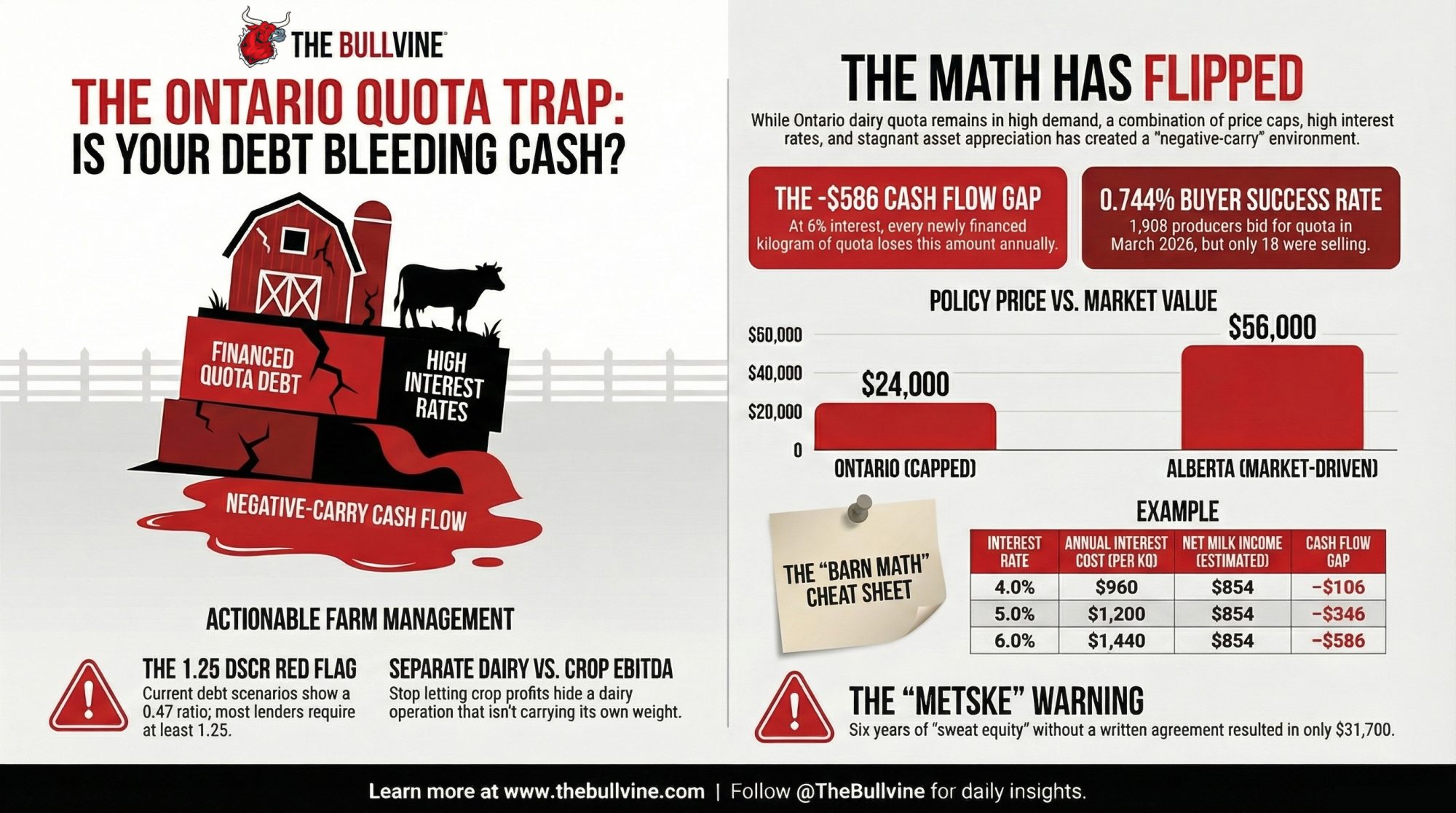 That number matters well beyond one family. It shows how fast sweat equity evaporates on a farm where the P5 quota cap fixes the single largest asset at $24,000 per kilogram of butterfat per day — a policy number, not a market number. And right now, the math on buying that asset has quietly turned against anyone carrying debt on it.