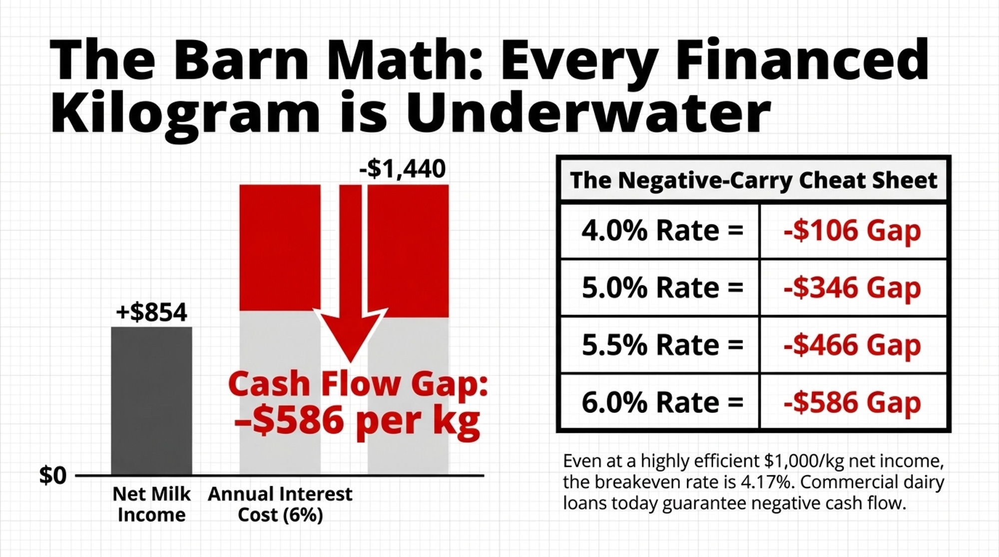 | Loan Rate | Annual Interest Cost/kg | Est. Net Milk Income/kg | Cash Flow Gap/kg/yr | Rate Needed to Break Even |