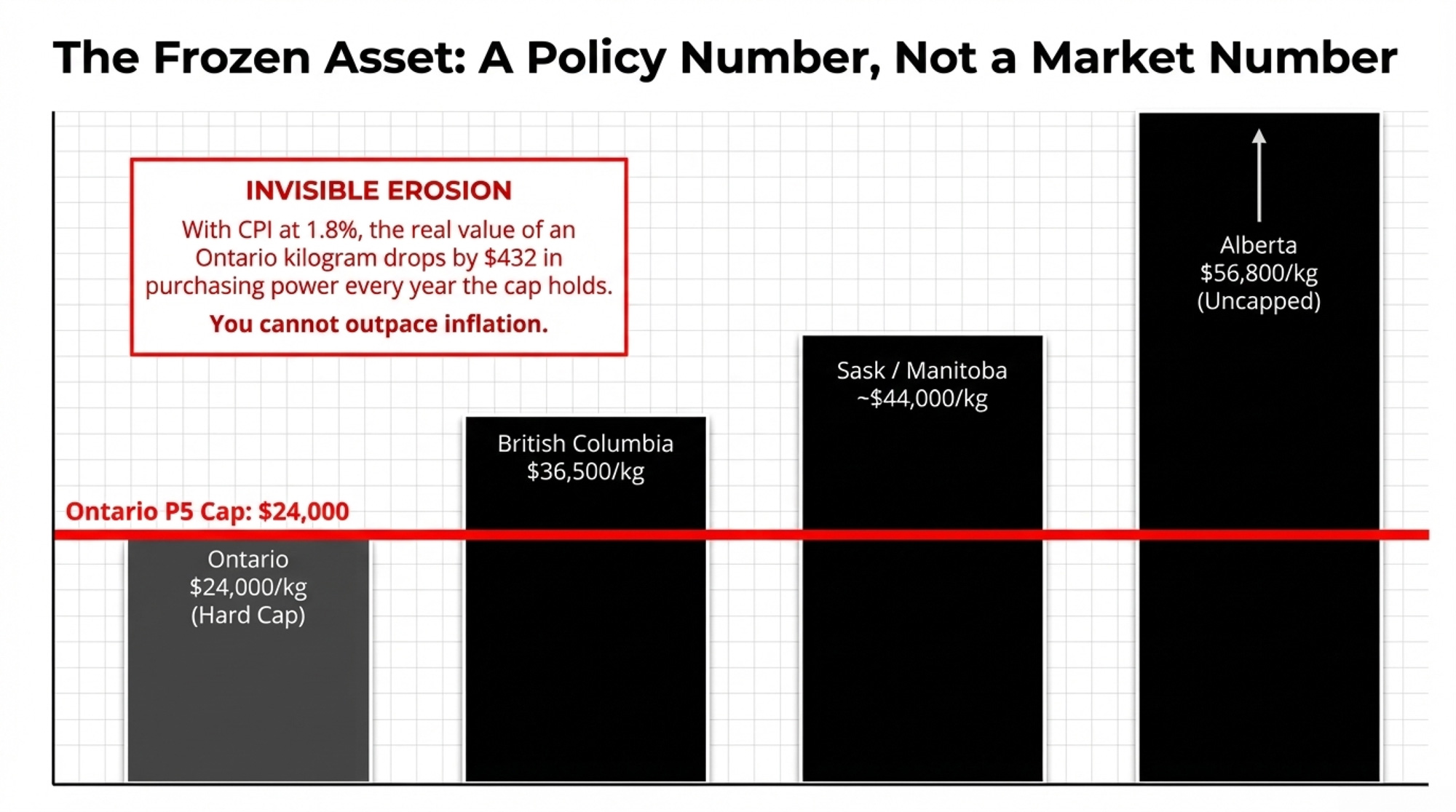 The cap shut off that tailwind. At $24,000/kg, Ontario quota is frozen. It doesn’t climb in a good year, track inflation, or compound. With CPI at 1.8% in February 2026, the real value of each kilogram drops by roughly $432 per year in purchasing power — money you won’t recover as long as the cap holds.