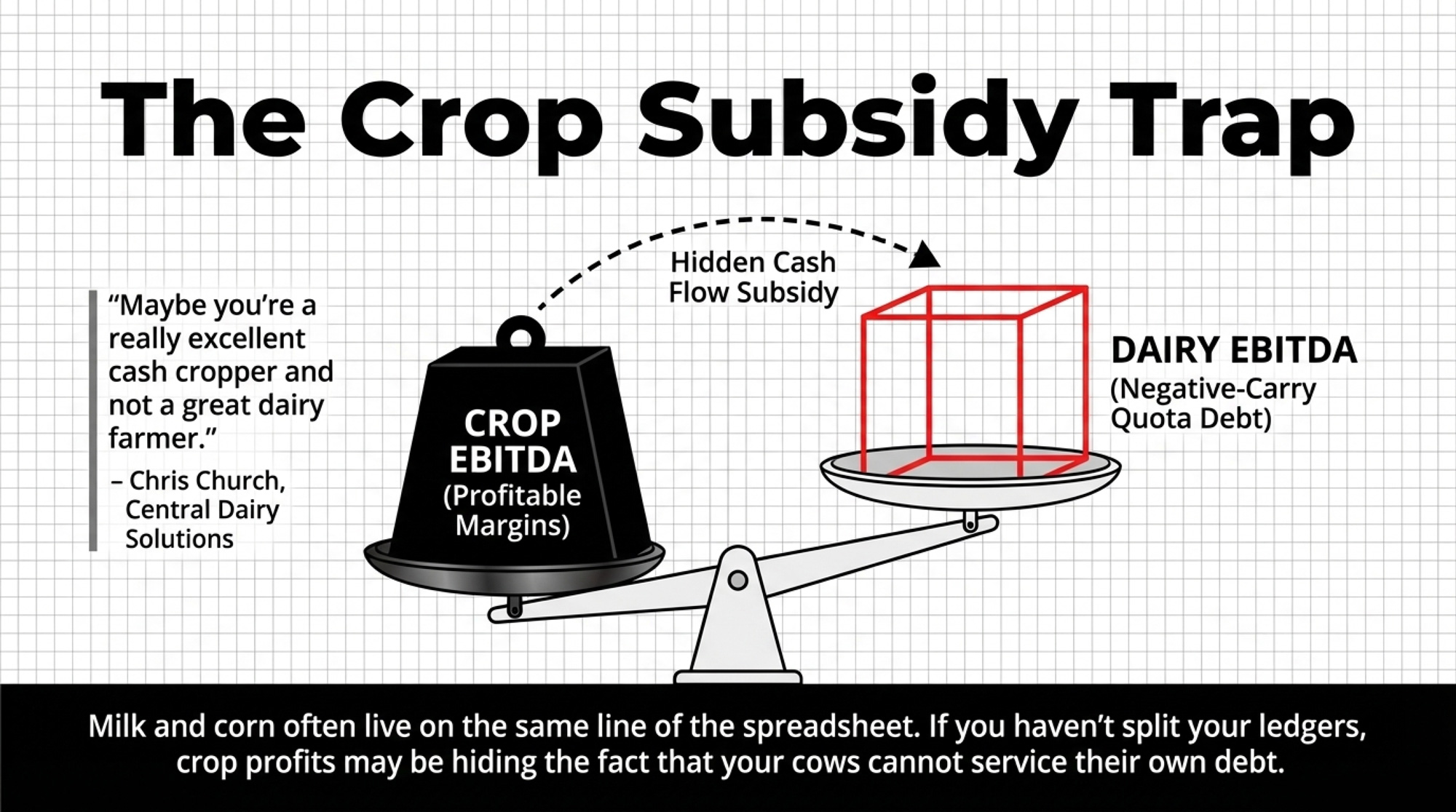 But when grain prices drop or weather punches your yields, that cross‑subsidy disappears. The dairy suddenly has to stand on its own. If it can’t, that’s when the bank meeting gets tense. And if your dairy numbers and your crop numbers live in the same line — while you’ve also got leveraged quota in the mix — you might be using crop profits to service a dairy business that, on its own, is financing a negative‑carry asset.