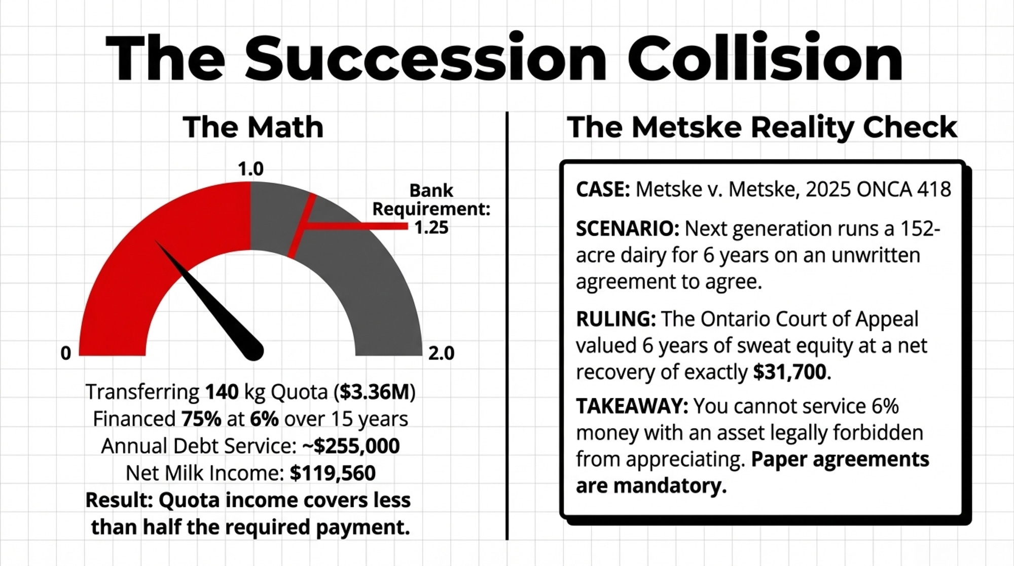 - If the next generation’s DSCR on quota debt alone falls under 1.25, the succession structure needs to change — not your kid’s work ethic. The Metske ruling shows where “we’ll figure it out later” ends: $31,700 for six years of contributed labour.
