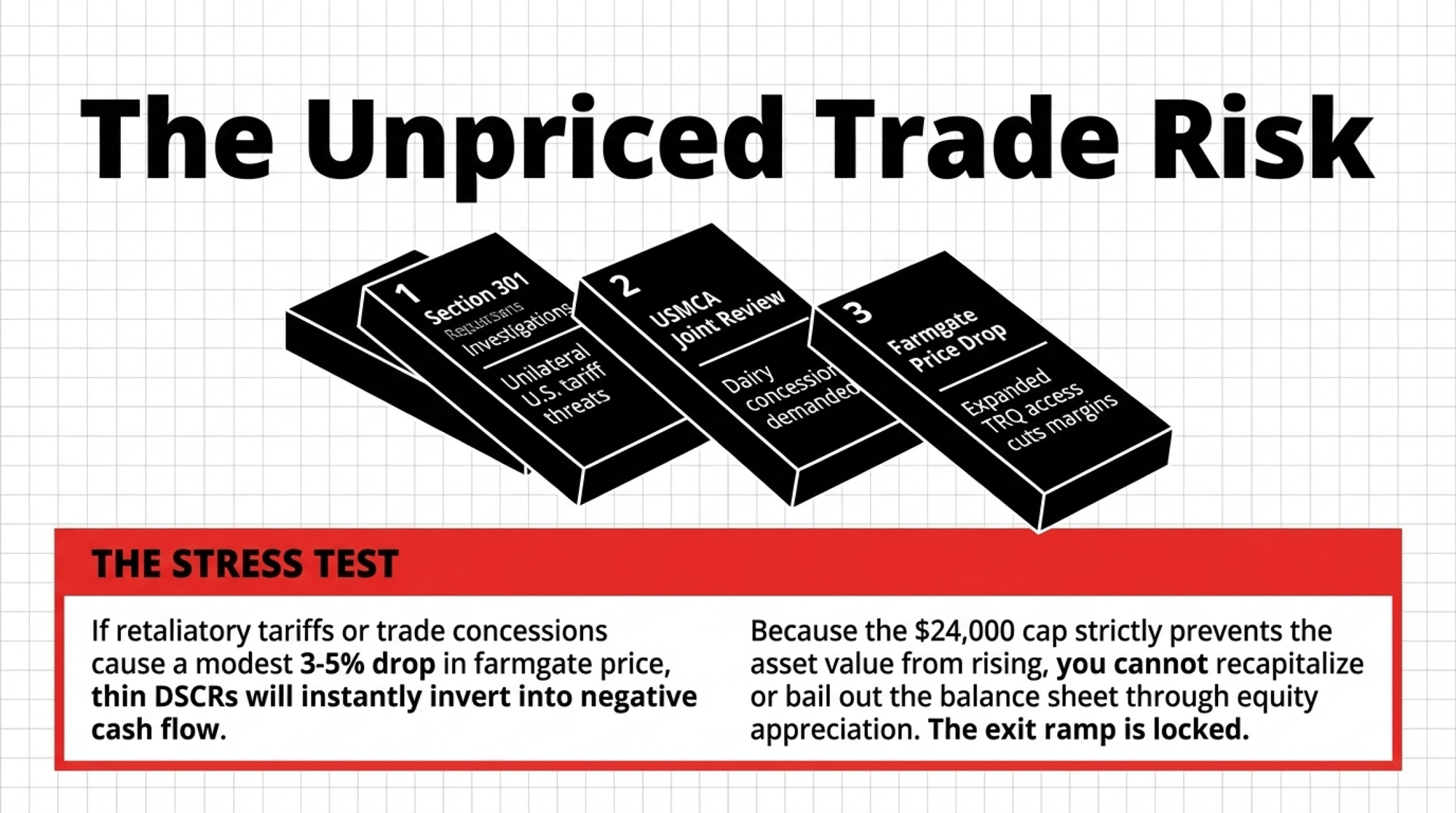 Here’s the stress test you can run on your own numbers: assume a modest 3–5% drop in farmgate price if TRQ access expands or tariffs bite. On a farm already running a negative‑carry quota, that price hit drops directly onto your already‑thin DSCR. If a 3–5% decline pushes you below 1.0, you’re into negative cash flow unless something else gives. The quota can’t bail you out by appreciating. The cap keeps that door shut.