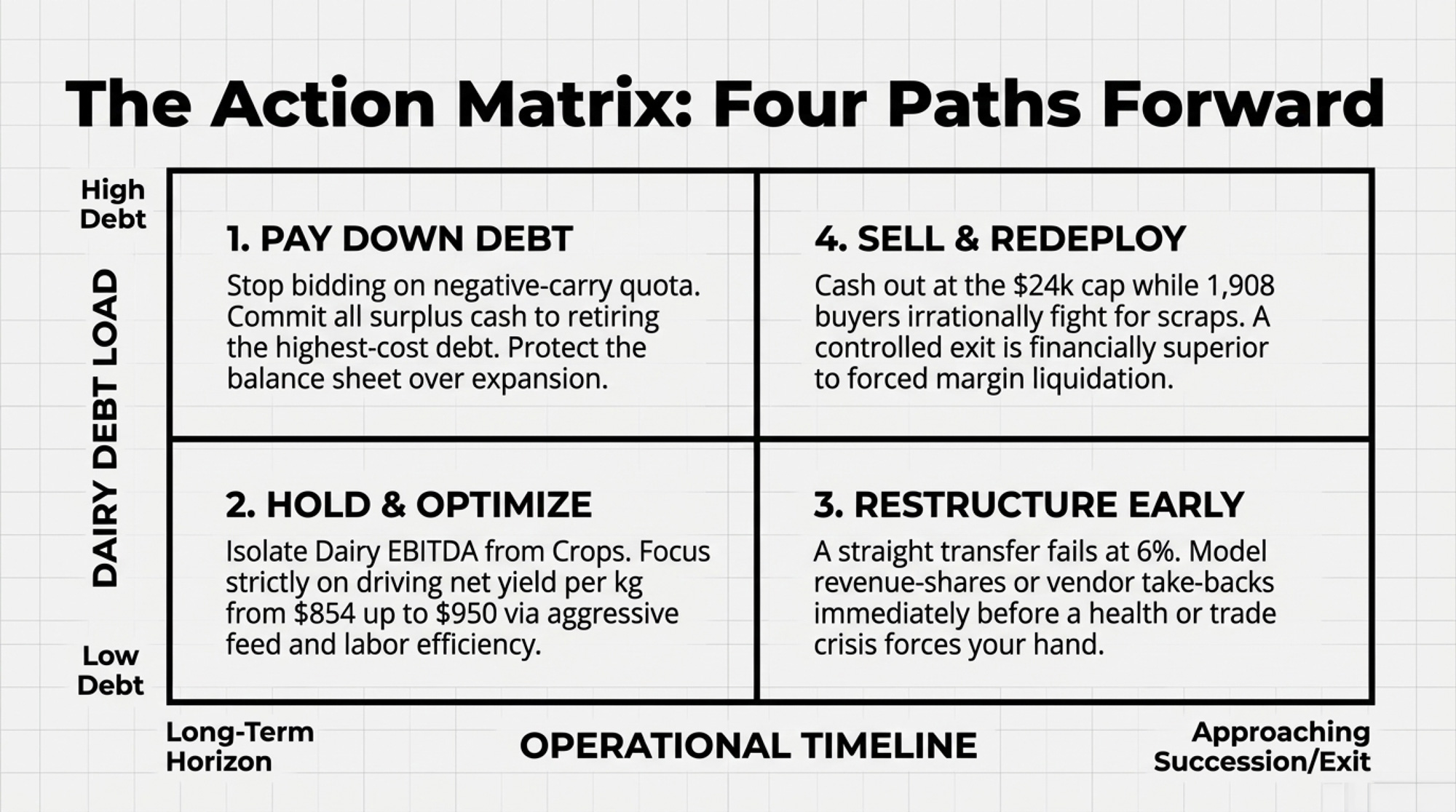 What it requires: Facing the hardest question in farming: is your equity better deployed in quota, cows, and concrete — or somewhere else? Selling quota into a market where 1,908 buyers are chasing 18 sellers at $24,000/kg turns paper into cash fast. That cash can fund debt elimination, retirement, or a pivot into a different enterprise entirely.