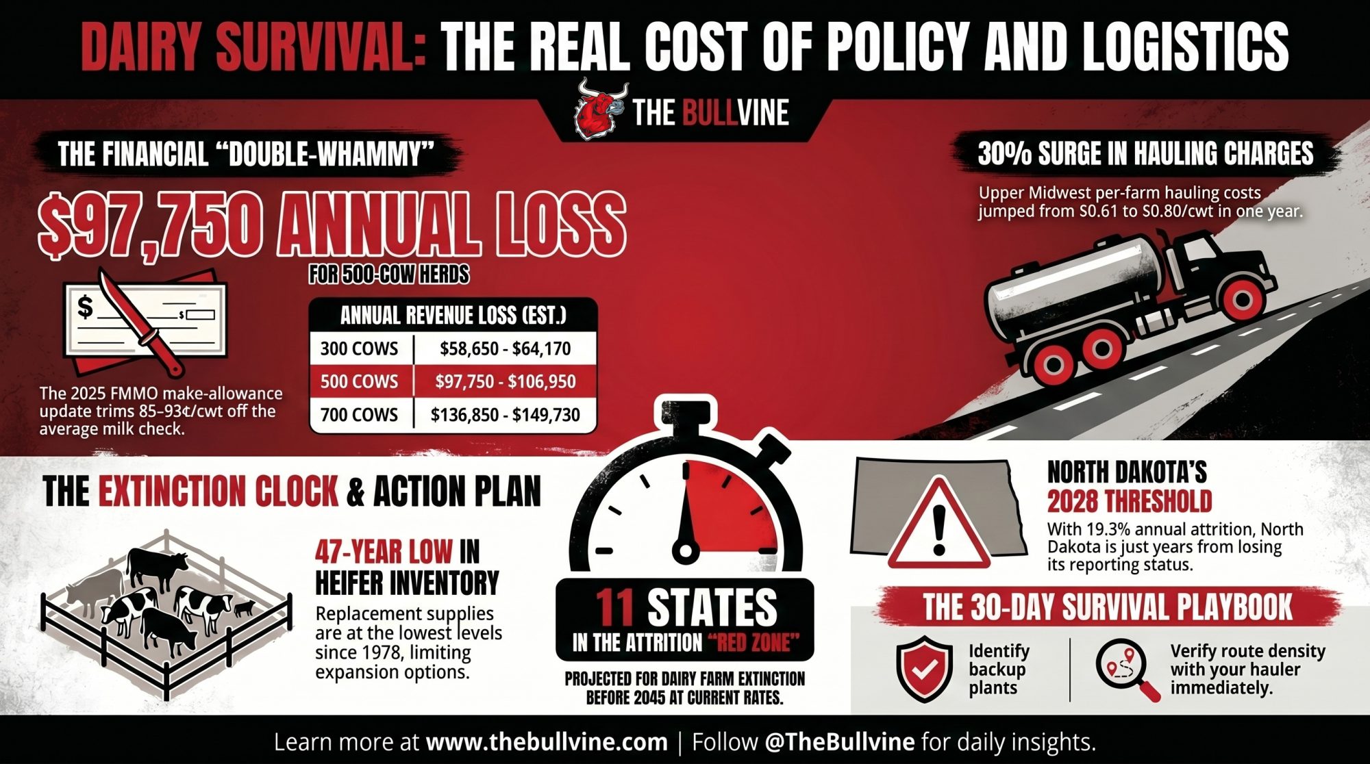 Federal Order 30 staff, USDA NASS, farmdoc, AFBF’s Daniel Munch, and North Dakota’s own agriculture commissioner are all saying the same thing from different angles: route access and policy drag are structural inputs in the dairy financial model now, not cyclical ones. Operators like the Holle family at Northern Lights Dairy got caught on the wrong side of that timing. The window to decide which side of the math you want to be on isn’t closing today, but on current attrition trends in Red Zone states, it’s narrowing year over year. Put your own map on paper, set your breakeven beside it, and answer the only question that actually matters: