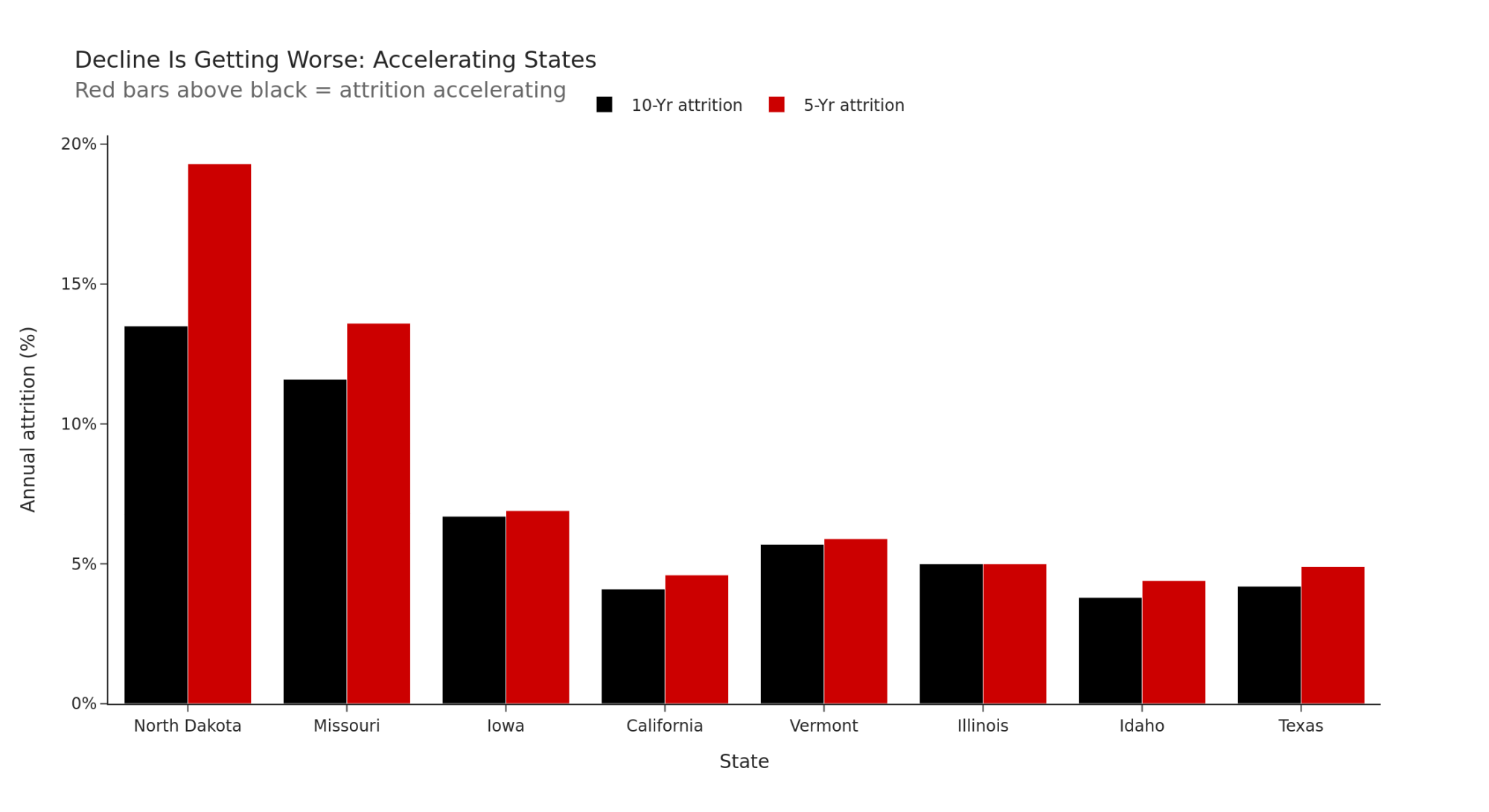 - If your state’s 5-year attrition rate exceeds its 10-year rate on the Clock table, you’re in an accelerating corridor. That’s a signal, not noise.