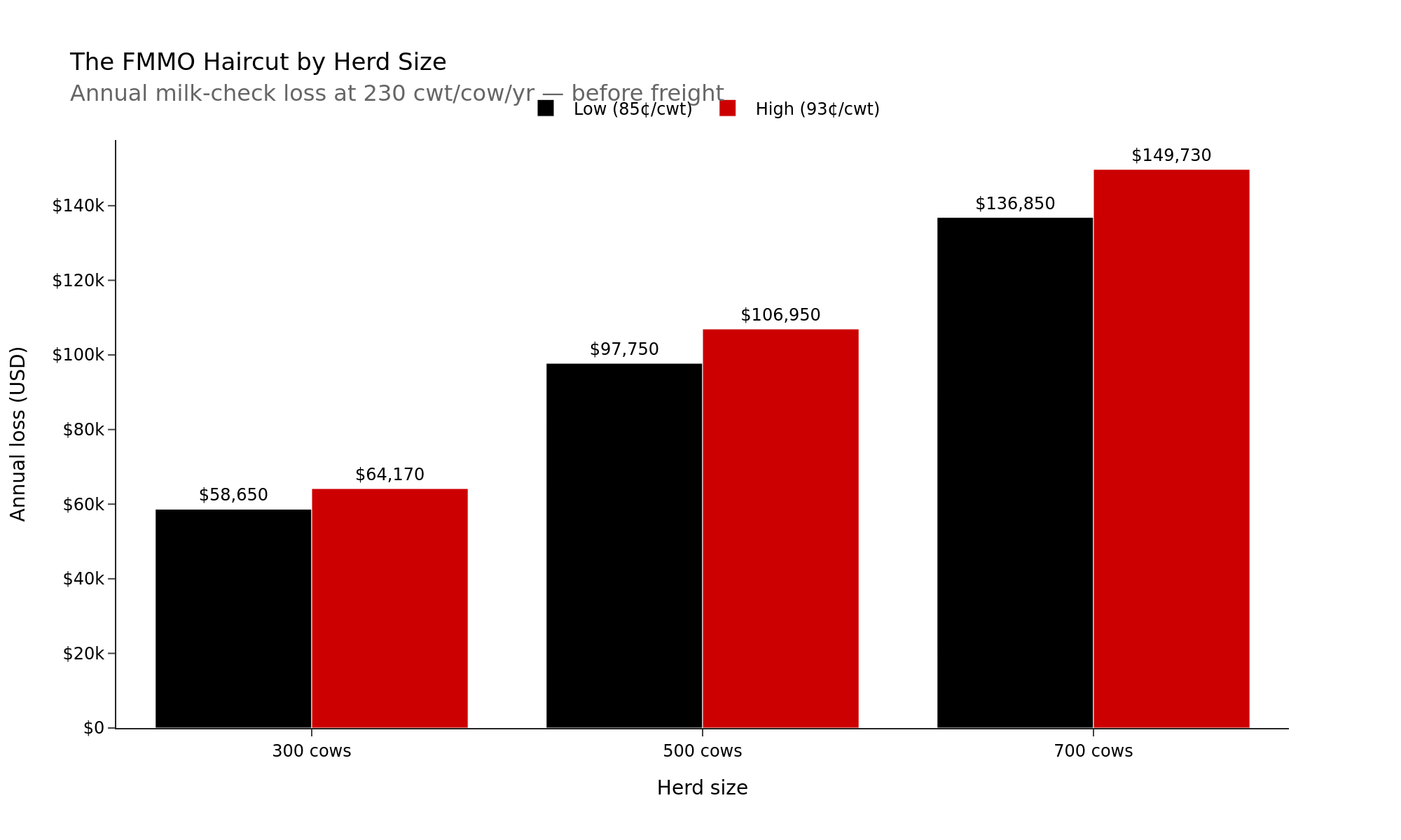 | Herd size | Production assumption | FMMO hit | Annual milk-check loss |