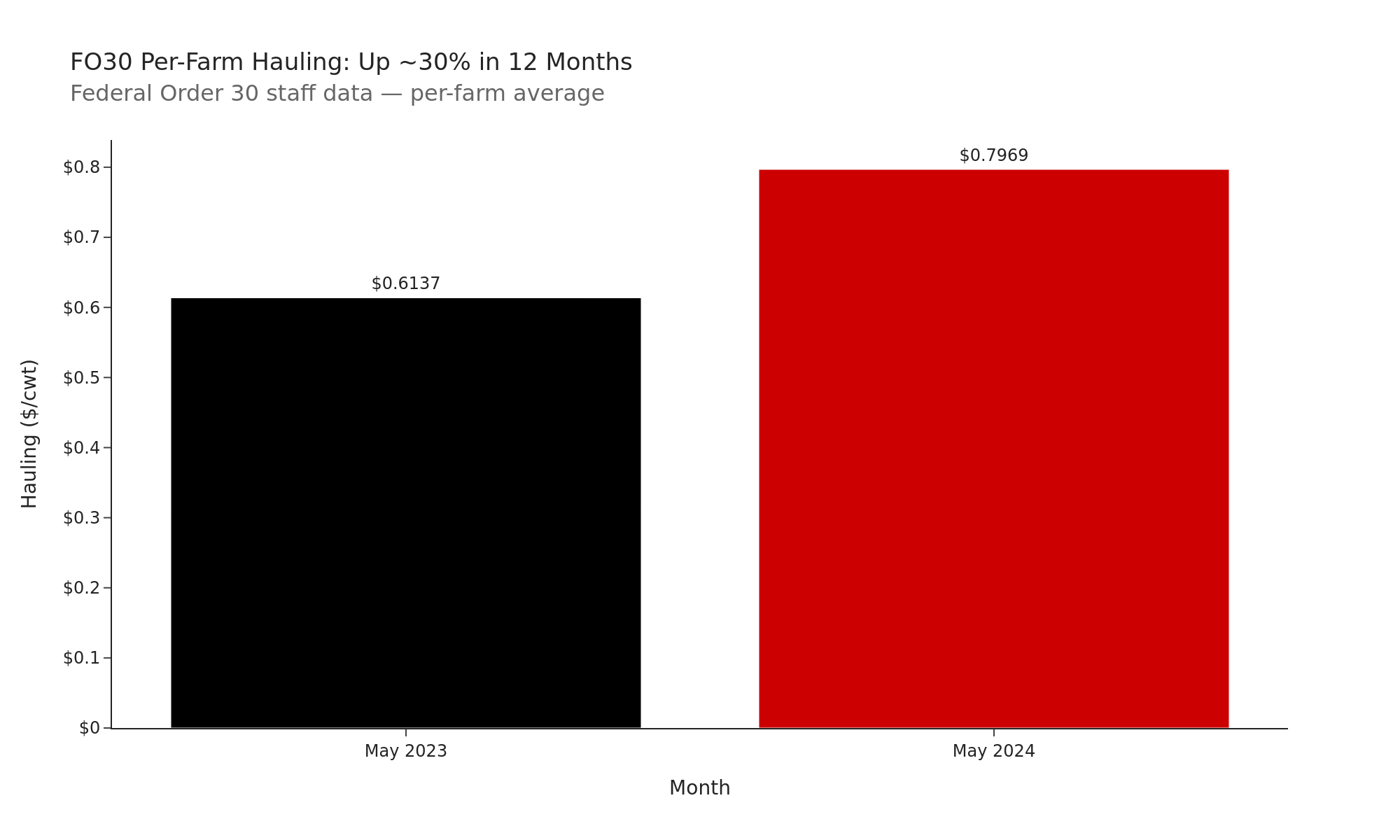 - Upper Midwest hauling charges averaged $0.6137/cwt in May 2023 and $0.7969/cwt in May 2024 — roughly 30% — on a per-farm basis in Federal Order 30 staff data. (Volume-weighted, the order-wide average is lower — $0.50/cwt in 2024 — because large-volume producers negotiate cheaper freight. The per-farm average better captures what small and mid-size herds actually pay.)