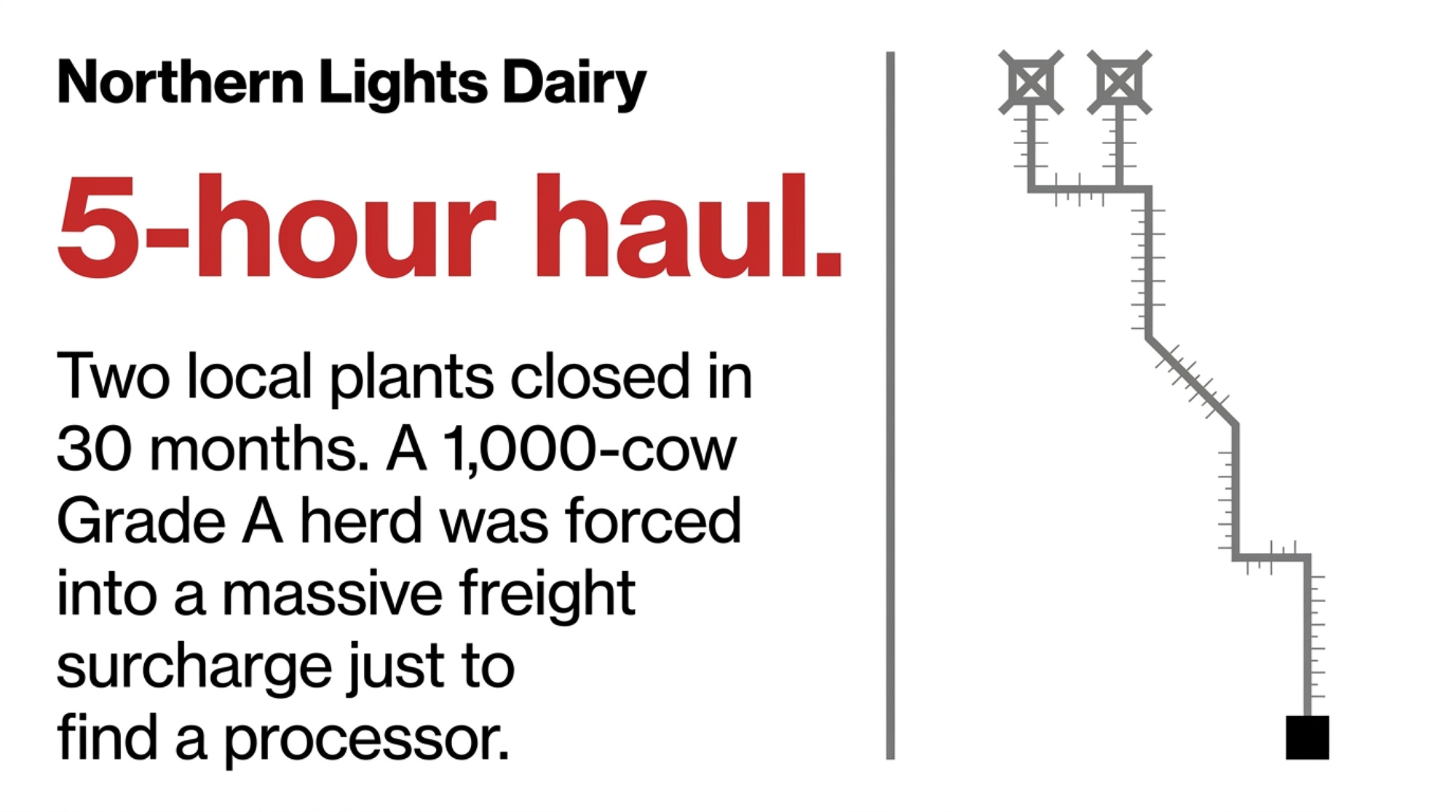 Another North Dakota producer, roughly 50 miles northwest of Bismarck, got rerouted 151 miles to Pollock after the Bismarck conversion — at a freight surcharge of about $0.55/cwt — and invested in a second bulk tank to handle every-other-day pickups. Then Pollock closed too. That’s a bulk tank on the balance sheet against a plant that didn’t outlast the depreciation schedule.