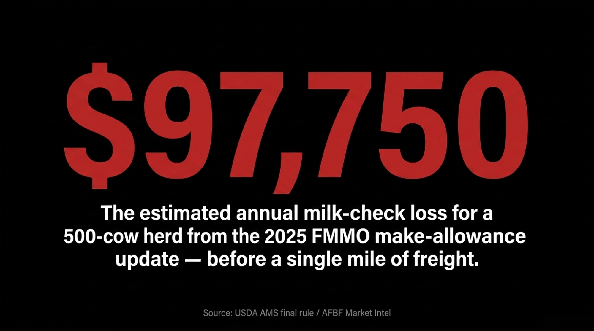 - The 2025 FMMO make-allowance change alone can pull an estimated $97,750–$106,950 a year off a 500-cow herd at 230 cwt/cow/year — before a dollar of freight gets layered in.