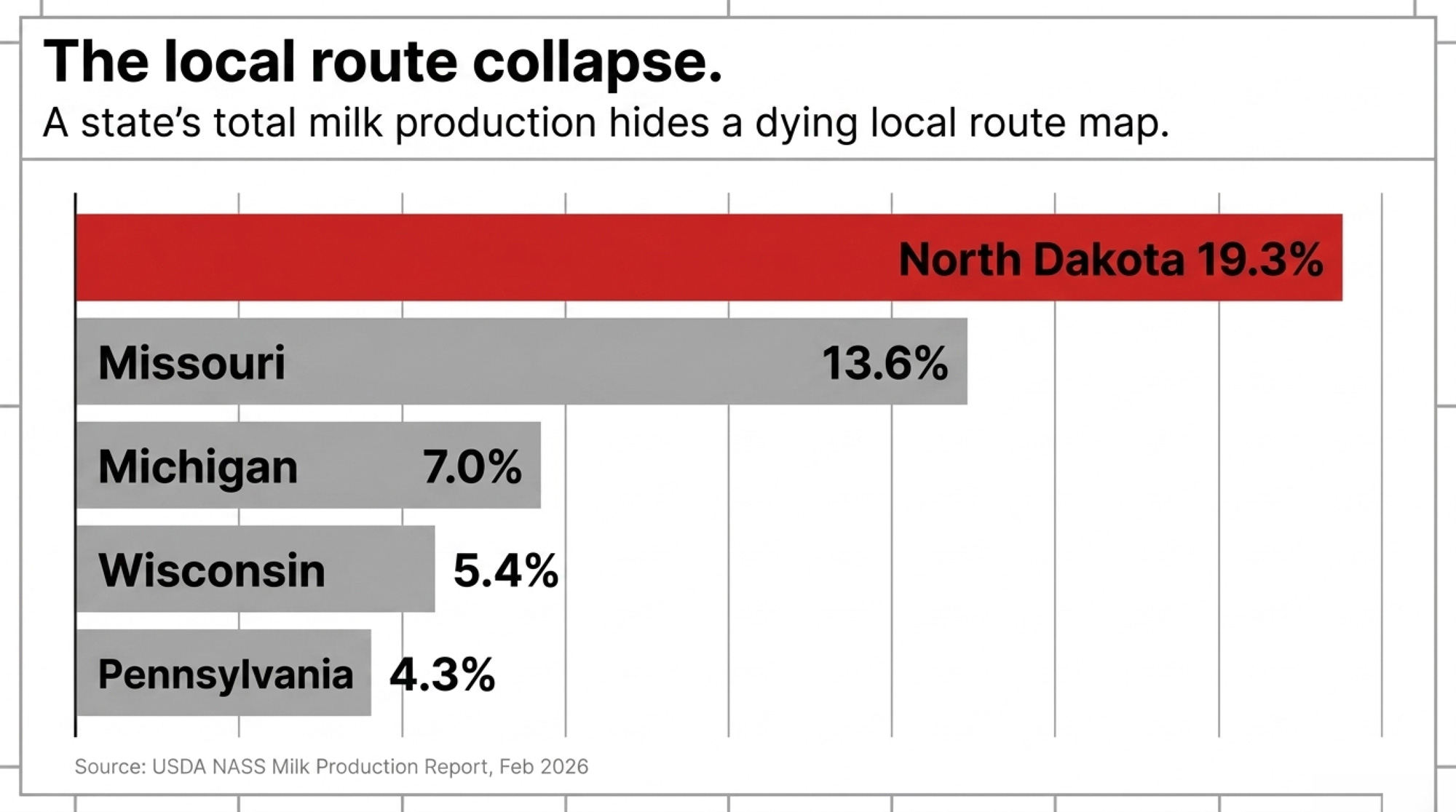 By early 2026, one of North Dakota’s last 18 Grade A dairies — the regulatory tier that can ship fluid milk, out of roughly 18–25 licensed dairies statewide — had been directed to a new milk market twice in 30 months. Not because production slipped. Not because a lender called a note. Because the state lost nearly every in-state processing option, and the nearest plant willing to take the load sat roughly five hours one way in Perham, Minnesota.