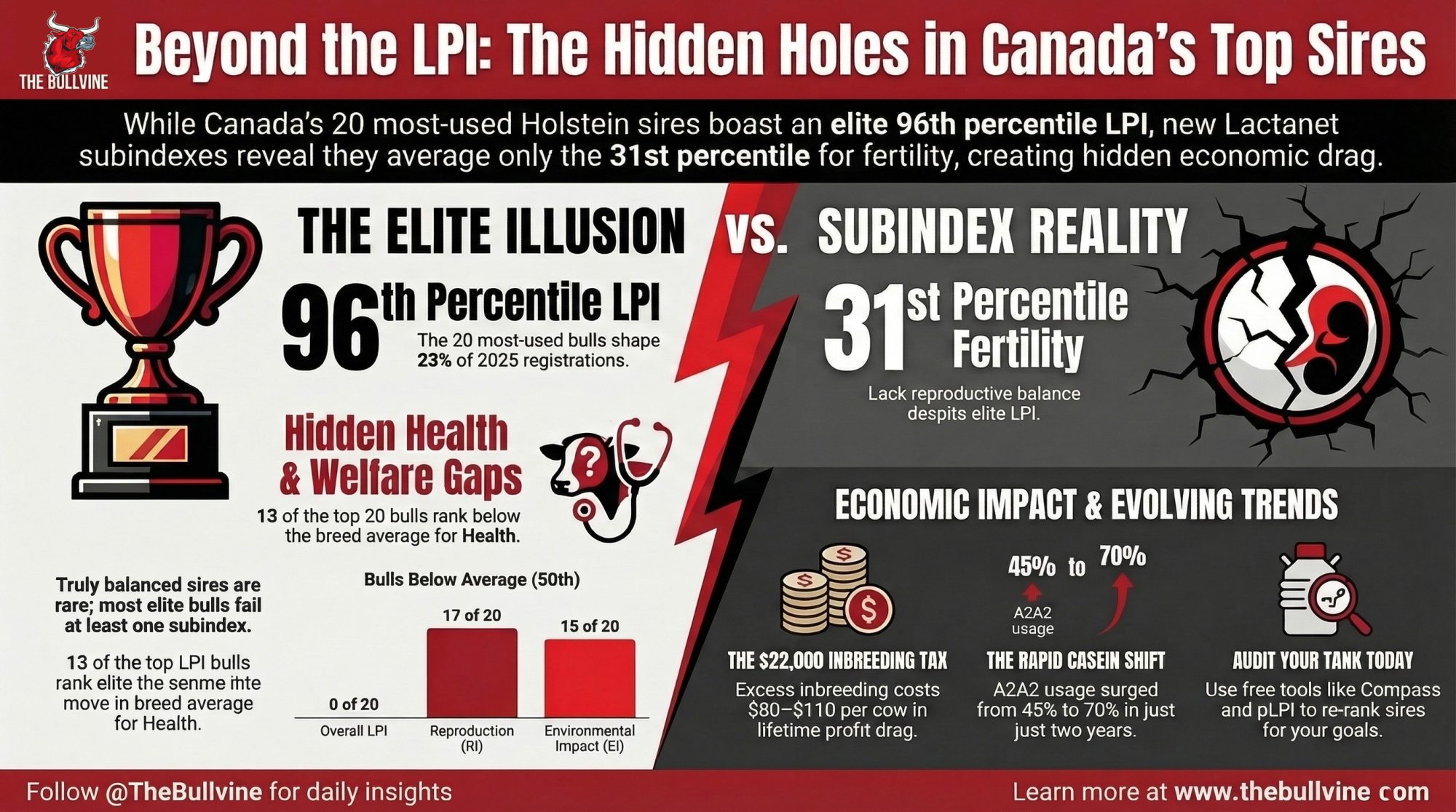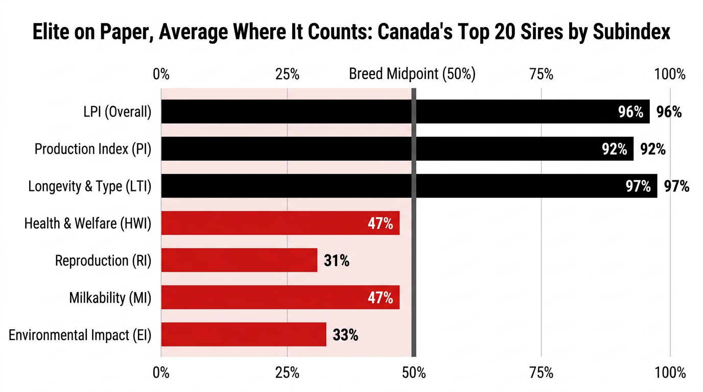 But the same proof sheets that make them dominant also expose a national breeding program tilted toward production and type at the expense of health, fertility, and genetic diversity. Lactanet gave breeders the subindex tools ten months ago. Whether the industry — AI companies, breed associations, and the producers writing the semen cheques — will use them before the next generation of heifers hits the milking string is the question that matters now.