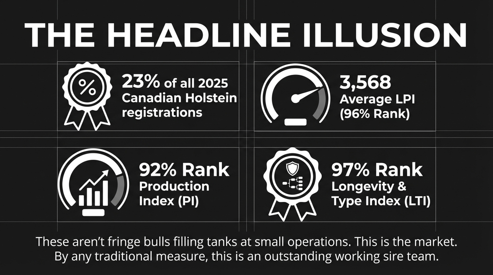 Not below the top quartile. Below the middle! These aren’t marginal bulls filling tanks at small operations — they’re the bulls shaping roughly 23% of all Canadian Holstein registrations in 2025, averaging about 2,940 daughters each, according to Holstein Canada data. A2P2 leads the list. Fuel sits at number twenty. On the December 2025 Lactanet proof sheets, the twenty average LPI hits 3,568 — the 96th percentile. By any traditional measure, this is an outstanding working sire team.