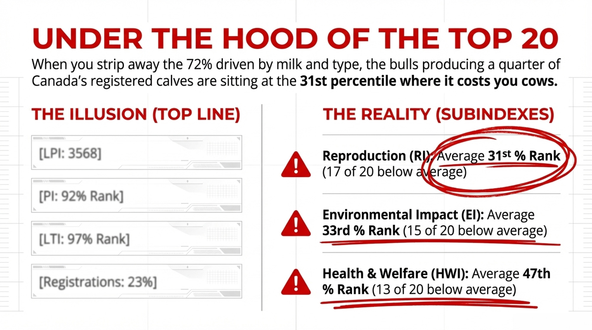 But the pattern is stark. Bulls producing nearly a quarter of all registered Canadian Holsteins average the 31st percentile on reproduction. Fifteen of the twenty fall below the breed midpoint on environmental impact. On health and welfare, thirteen of the twenty sit below average.