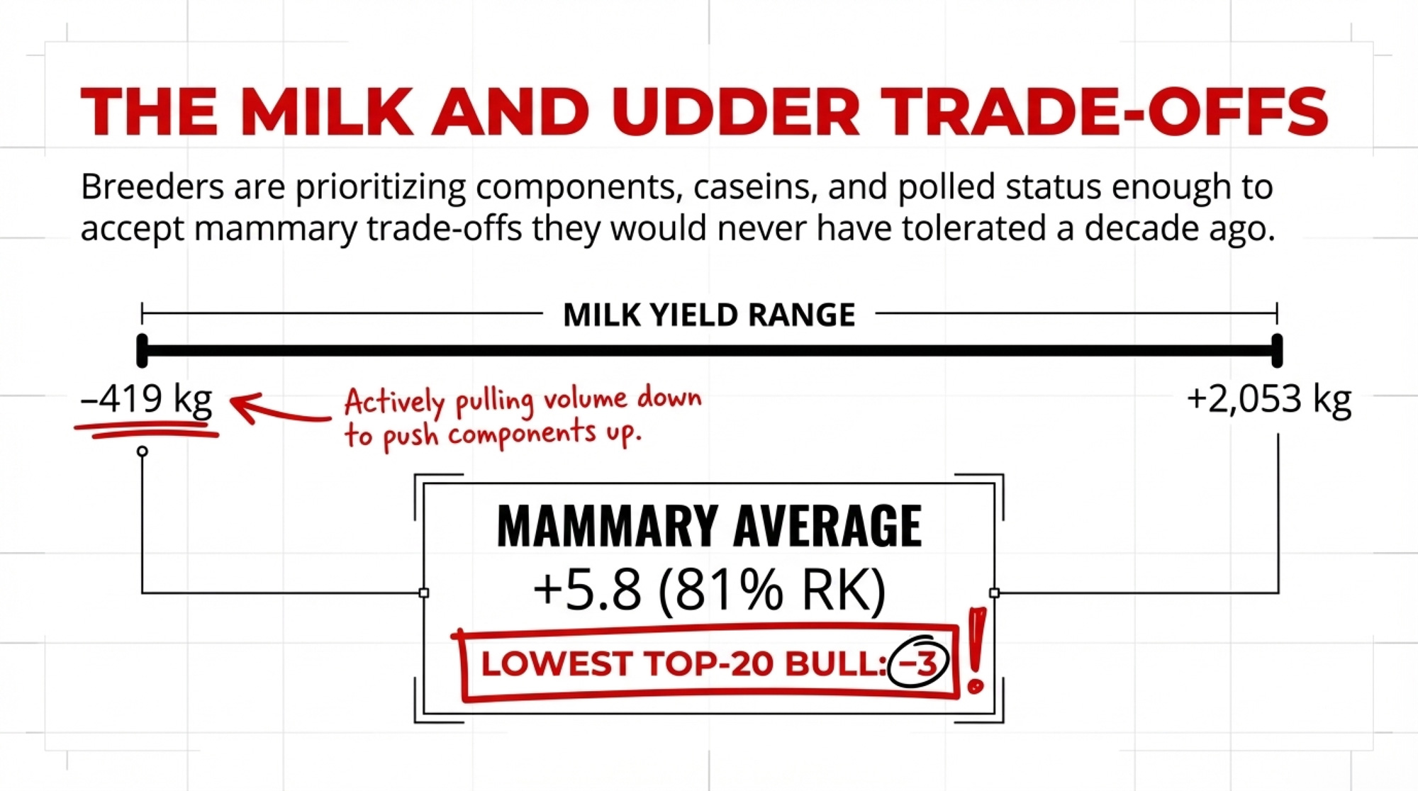One number is lower than expected: Mammary at +5.8 and 81% RK. Mammary System carries 37% of the LTI subindex in the modernized formula, so you’d think the most-used bulls would rank higher. One bull in this group actually scores −3 on the Mammary trait. When a sire below average on udders still cracks the top-20 usage list, it tells you breeders are prioritizing other traits — components, caseins, polled status — enough to accept trade-offs they wouldn’t have a decade ago.