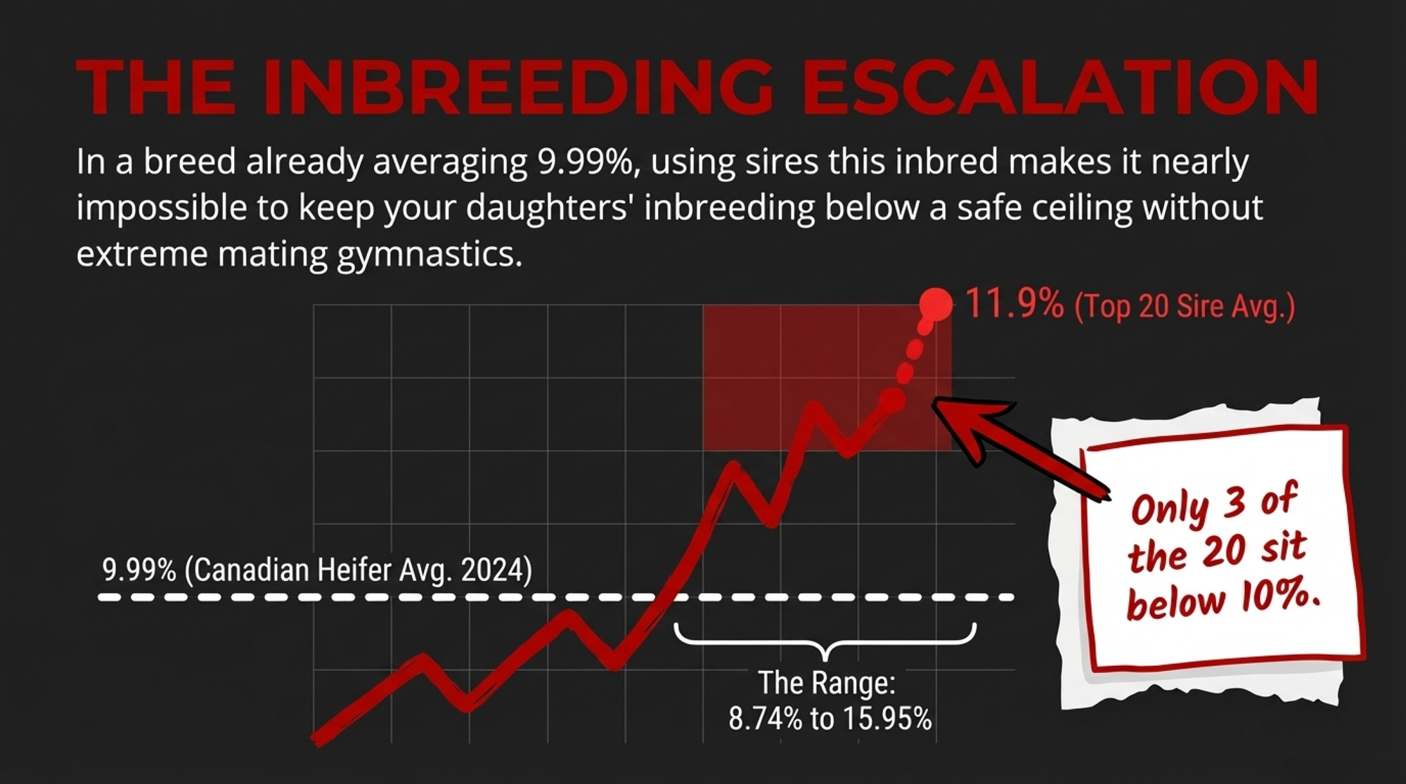 For context: Lactanet’s August 2025 inbreeding update reported that the average inbreeding level for Canadian Holstein heifers born in 2024 reached 9.99%. On a pedigree basis, Holstein inbreeding has been increasing by approximately 0.25% per year since 2010, according to Lactanet’s annual reports authored by Brian Van Doormaal. That’s the breed average. These twenty bulls — the ones shaping nearly a quarter of the next generation — sit almost two full percentage points above it.