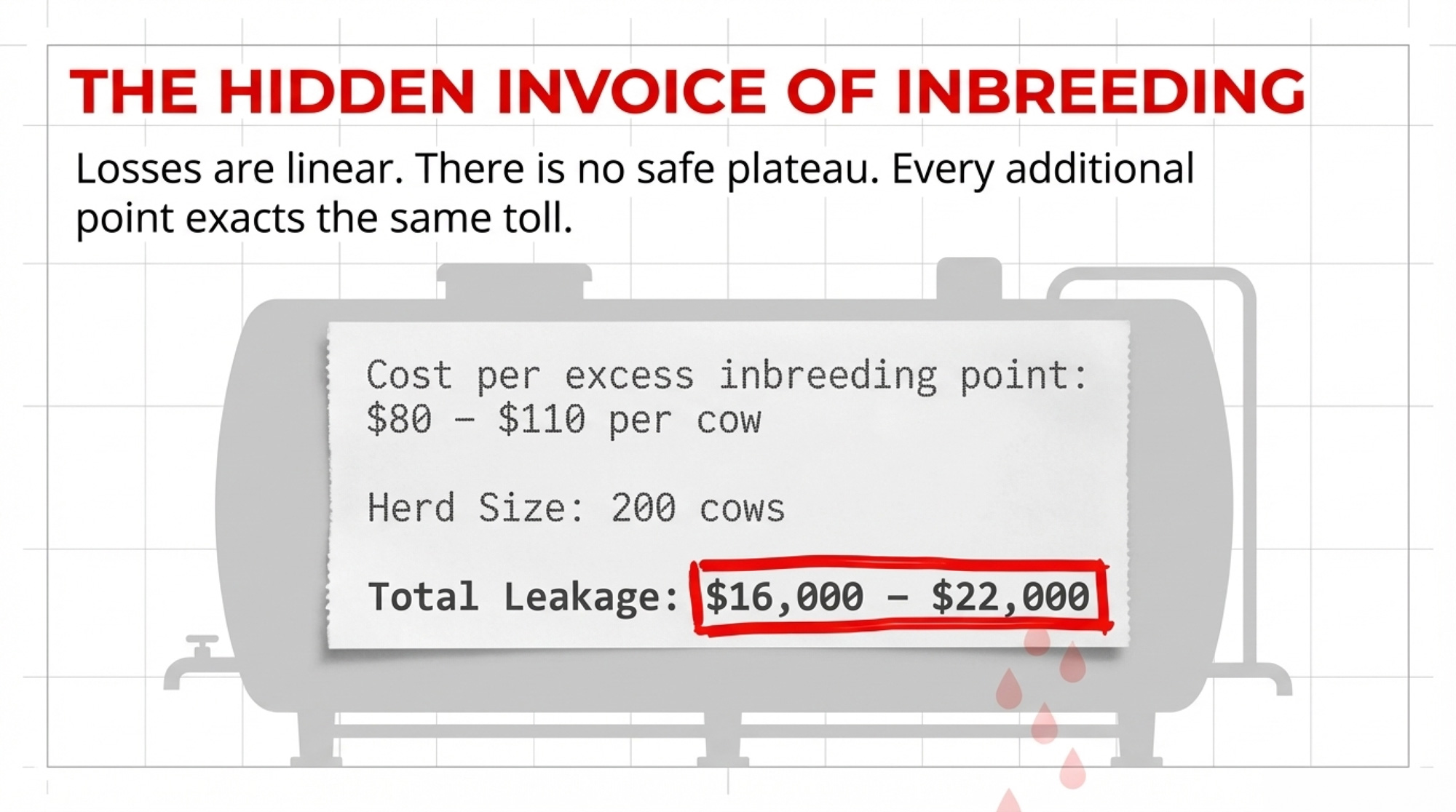 - At 11.9% sire inbreeding in a breed averaging 9.99%, the cost of genetic narrowing runs roughly $80–$110 per cow in lifetime profit drag, depending on mating patterns — using Virginia Tech registered-cow estimates adjusted for inflation. On a 200-cow herd, that’s $16,000–$22,000 that shows up in your replacement pipeline, not on any invoice.