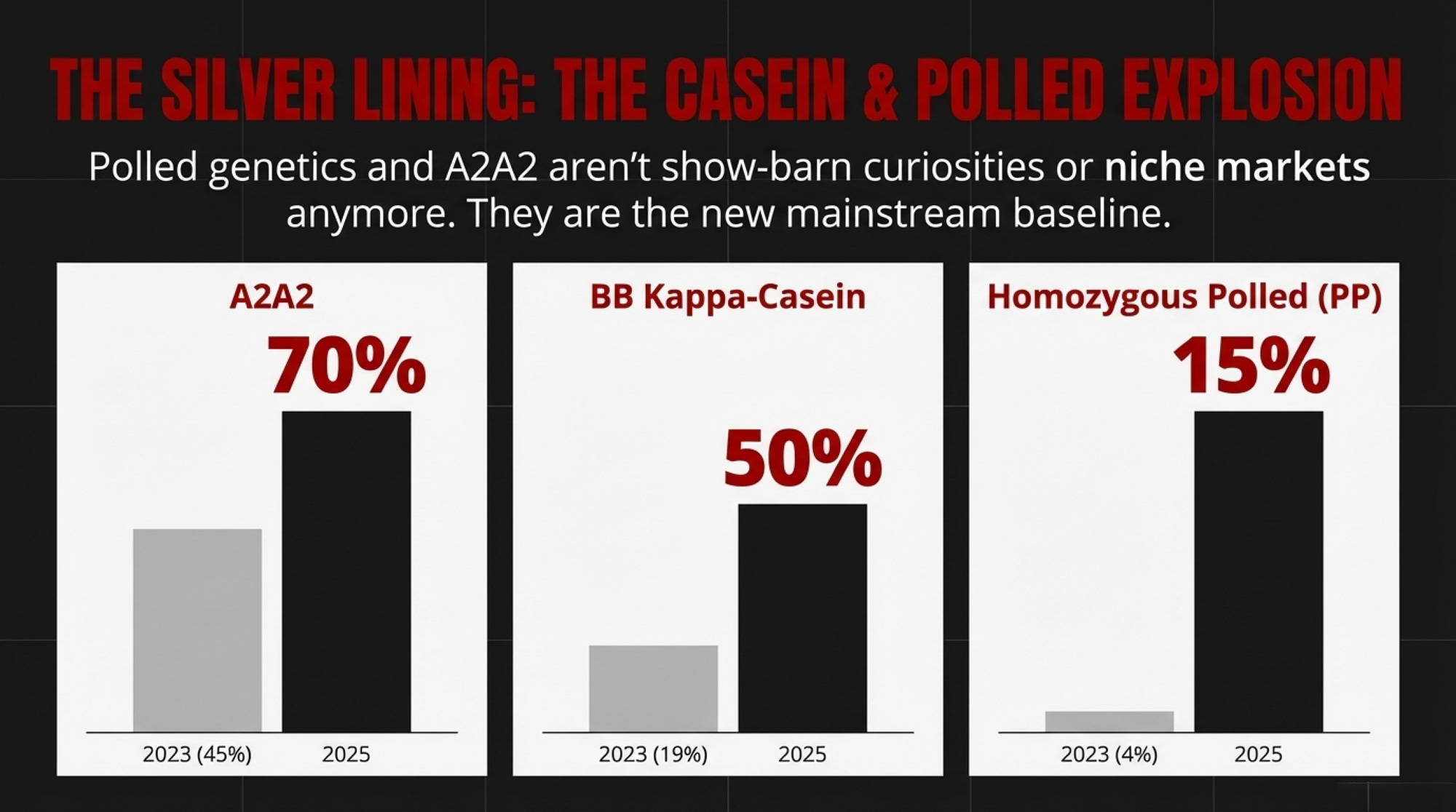 - The casein and polled shift is accelerating. A2A2 went from 45% to about 70% of top-use sires in two years; BB kappa-casein from 19% to about 50%; homozygous polled from 4% to about 15%.