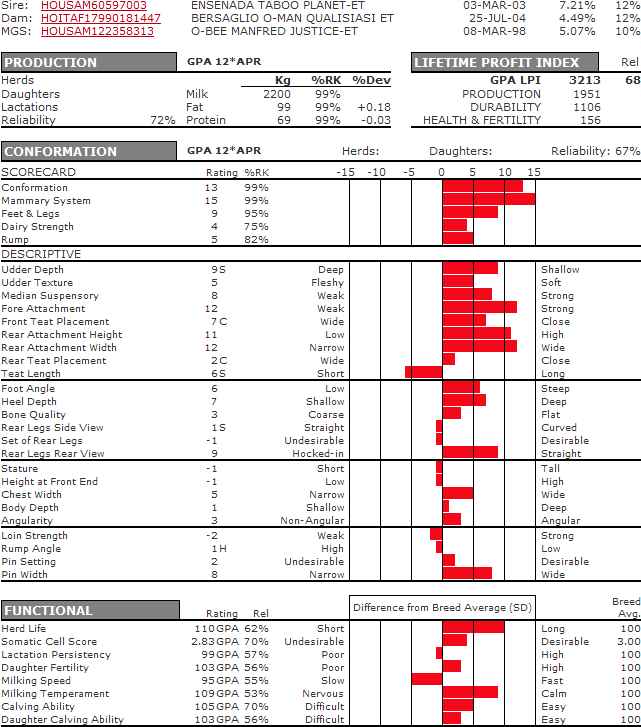 AltaAQUANTUM’s dam, BERSAGLIO O-MAN QUALISIASI VG-87-2YR-ITA is one of the highest contracted dams in Europe and one of the best O Man’s in the world. During her first lactation this well balanced, shallow uddered )-Man daughter scored the maximum score of VG-87 as a 2YR old and produced almost 13,000 kg of milk. Grand dam of AltaQUANTUM is the very fancy BERSAGLIO MTOTO LOCANDA VG-87-3YR-ITA, one of the best and most requested Mtoto daughters in Europe. Next dam is Bersaglio Corsa VG86, a powerful, deep cow sired by Del Santo Corsaro (Aerostar x Chief Mark). The cow family behind AltaQUANTUM has lots of production, health and functional type in the pedigree. Watch for AltaQUANTUM to sire strong production with balanced type. Contrary to what his sire stack would indicate, he will sire strong conformation improvement (DGV of 17 for conformation compared to EBV PA of 7). Also, expect AltaQUANTUM to be a strong mammary system improver with a very similar type-breeding pattern to his sire, Planet, but with a little bit better rumps.