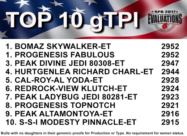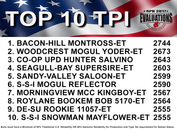 Rounding out the top 10 proven TPI are established sires #4 SUPERSIRE, #5 SALOON, #6 REFLECTOR, #7 KINGBOY, #8 BOB, #9 ROOKIE and #10 MAYFLOWER.