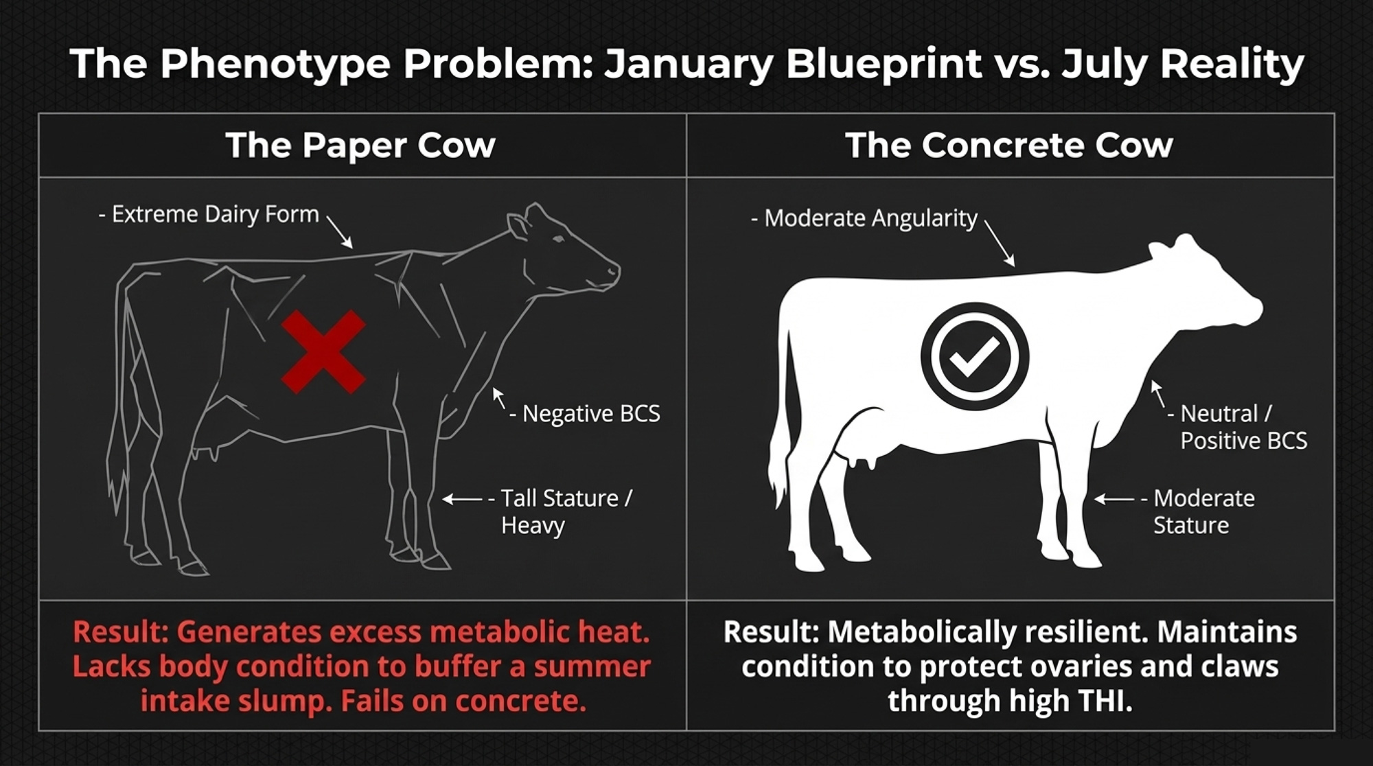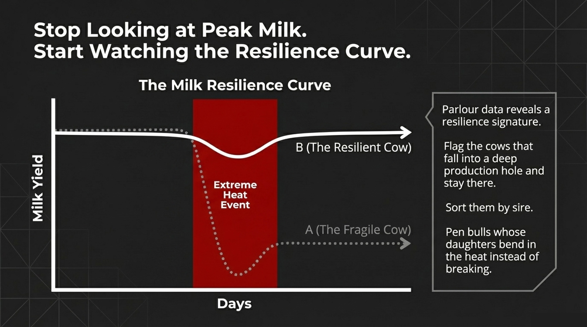 - Stress‑test a three‑year cashflow with a $0.50–$1.00/cow/day drag. Multiply that by your cow count and plug it into your IOFC and lender conversations. If the model holds at that haircut, you’ve got room to ride out the genetic lag. If it doesn’t, you need a different plan — more scale, a different market, or a different timeline.