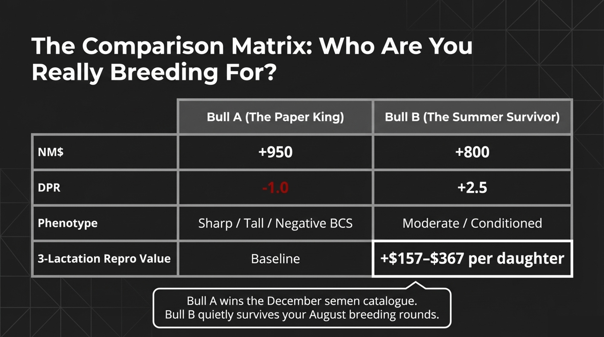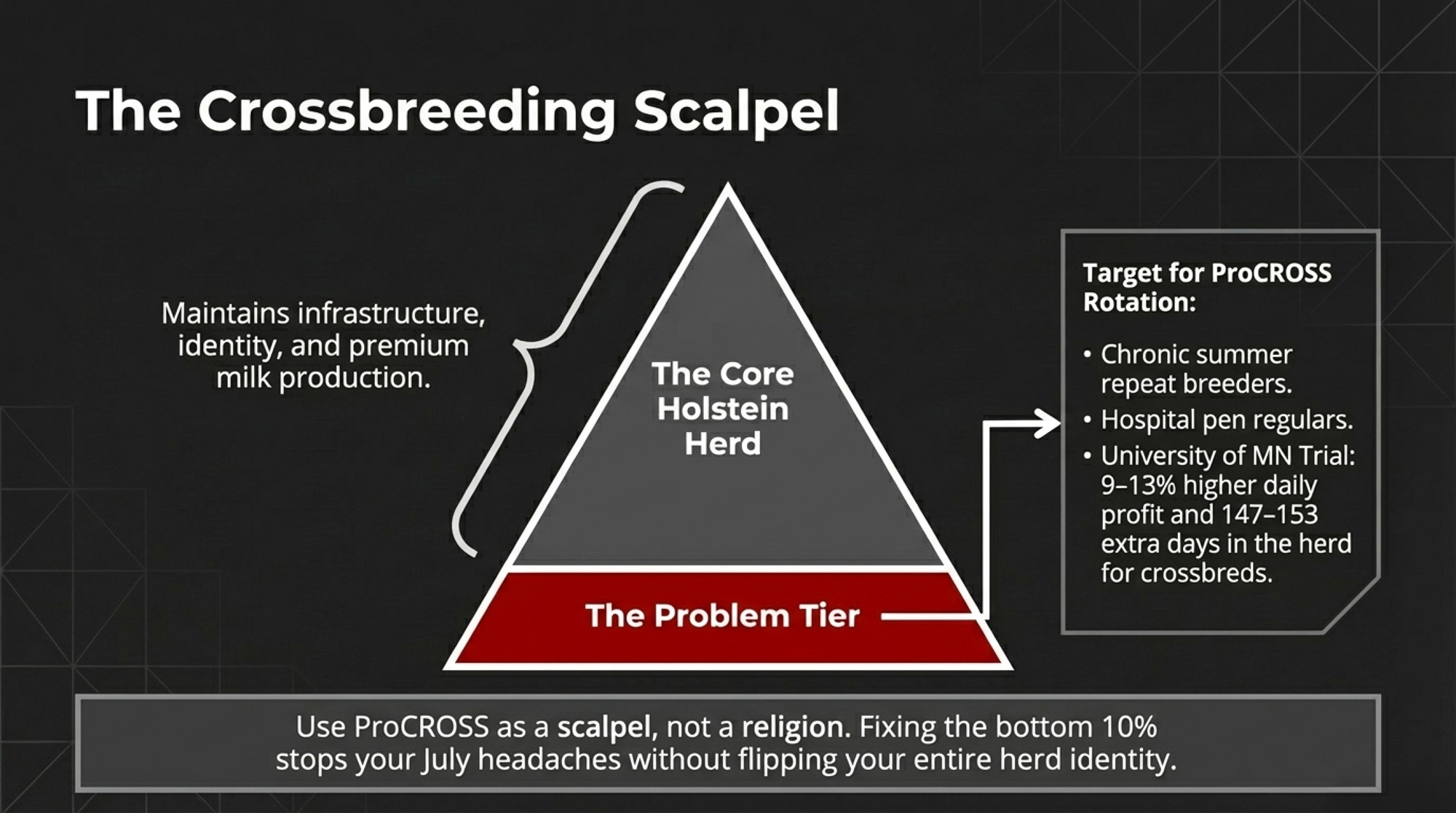 - If your 2027–2029 heifer crop looks just like your 2019–2022 cows on paper, you’ve locked in three more years of margin drag. Use genomics, sexed semen, and beef‑on‑dairy to change that trajectory now.